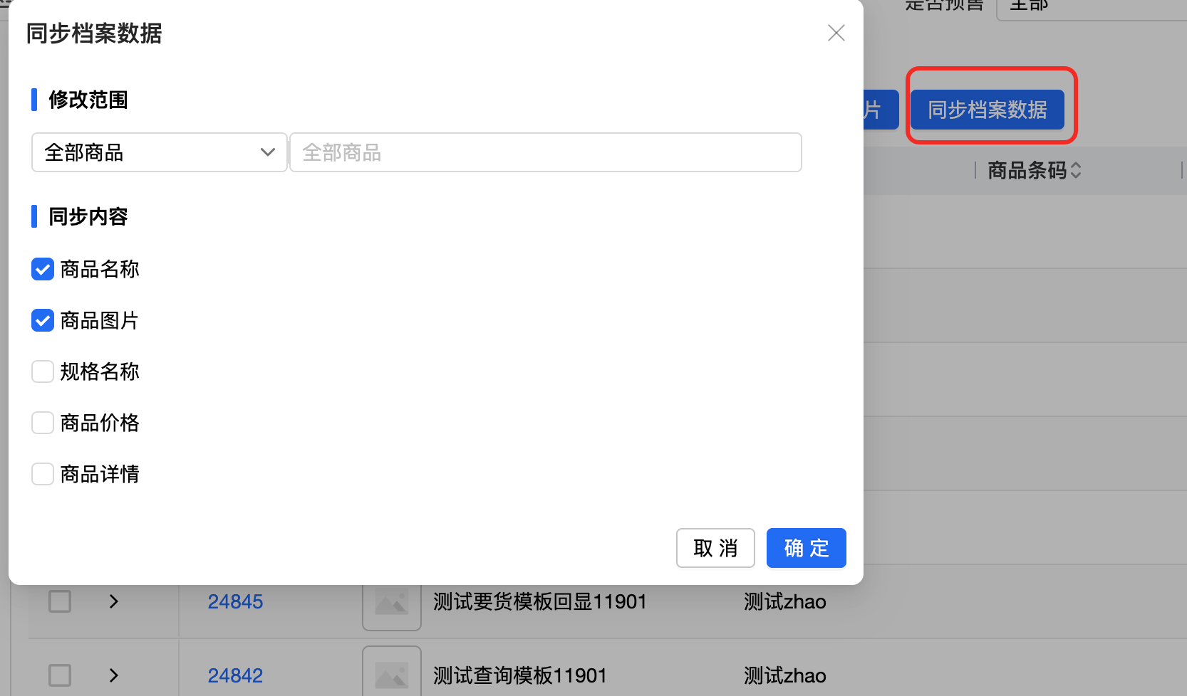 新界面,商品库,增加【同步档案数据】按钮,点击展示同步弹窗