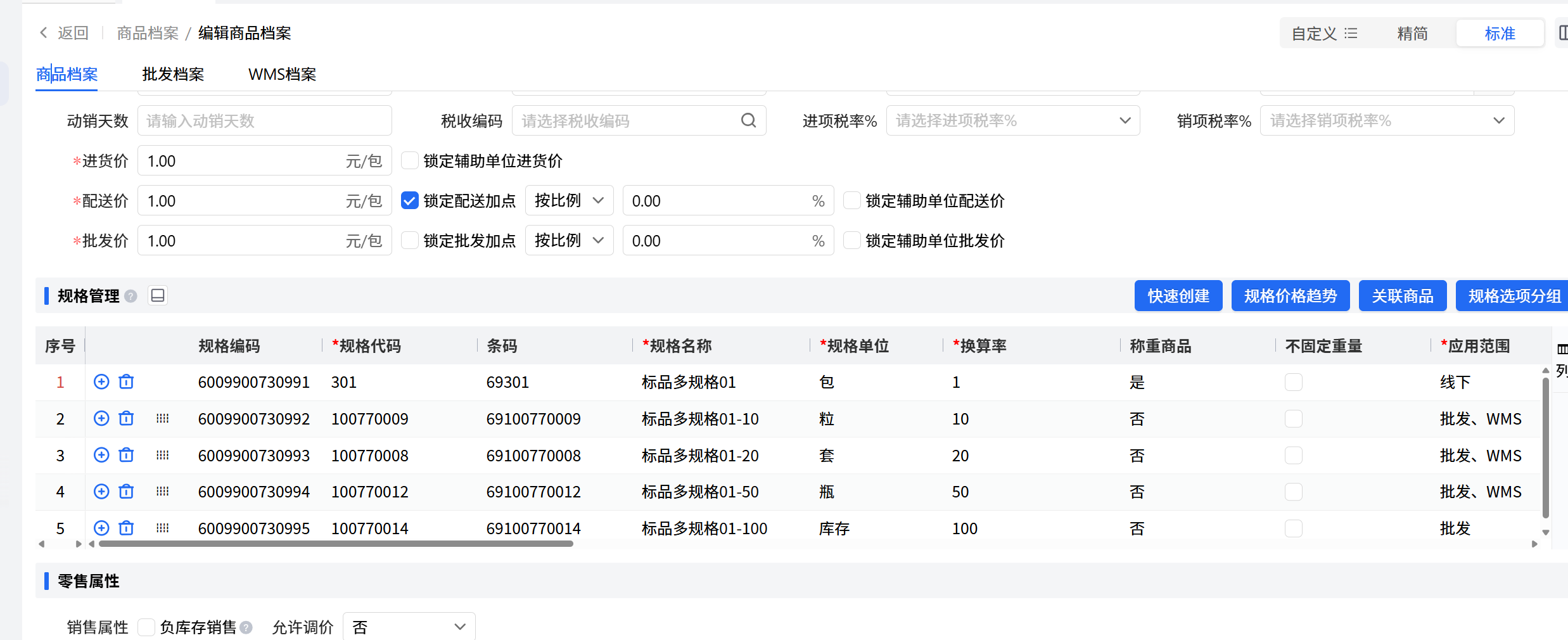 WMS商品查看:新WMS-WMS商品-明细界面“订货规格(多配送单位)”及“规格商品”标记