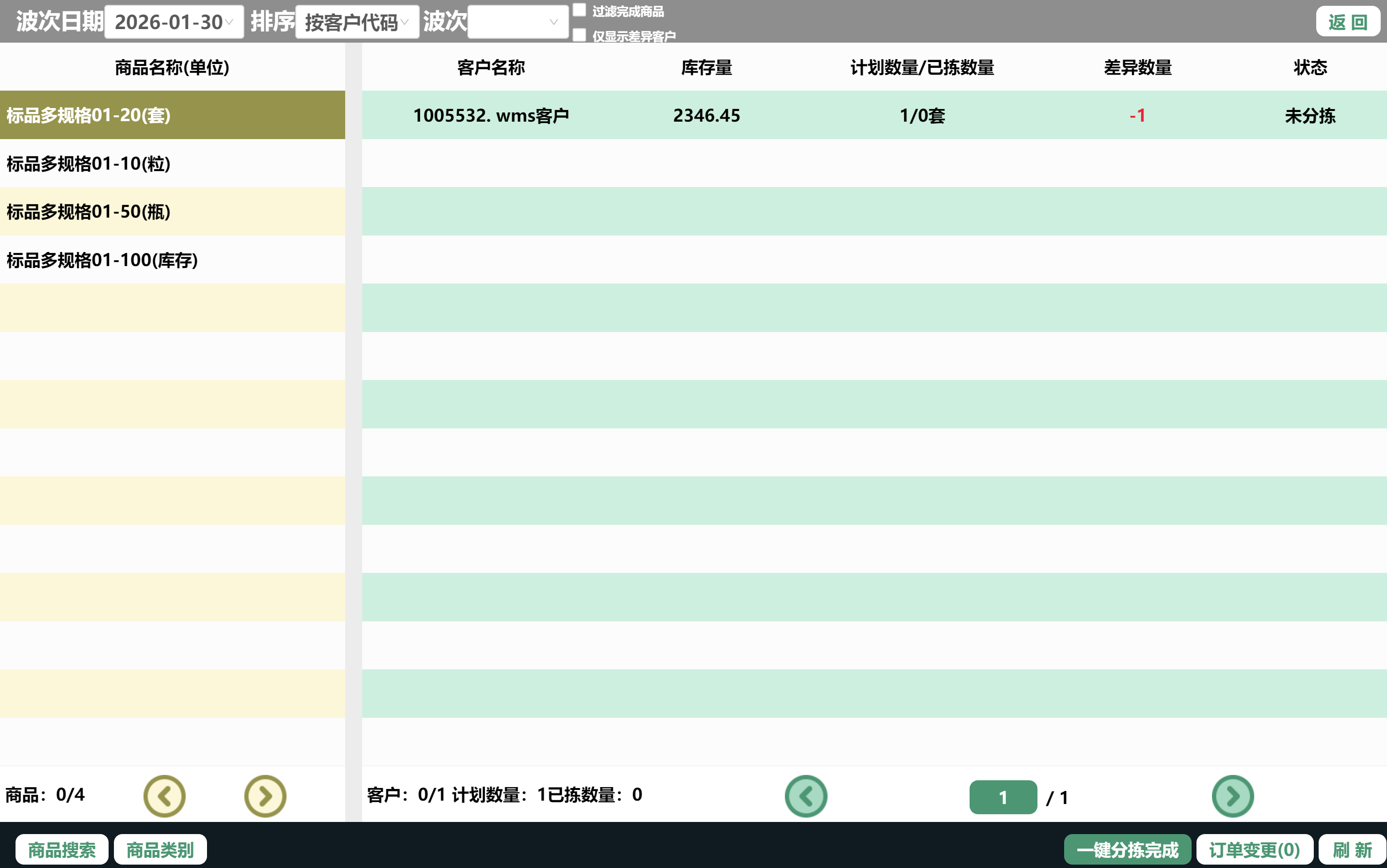 混合拣货操作:仓配App-混合拣货(按商品/按客户)、分拣Pos-混合拣货(按商品/按客户)-按订货规格完成拣货、标记缺货等操作