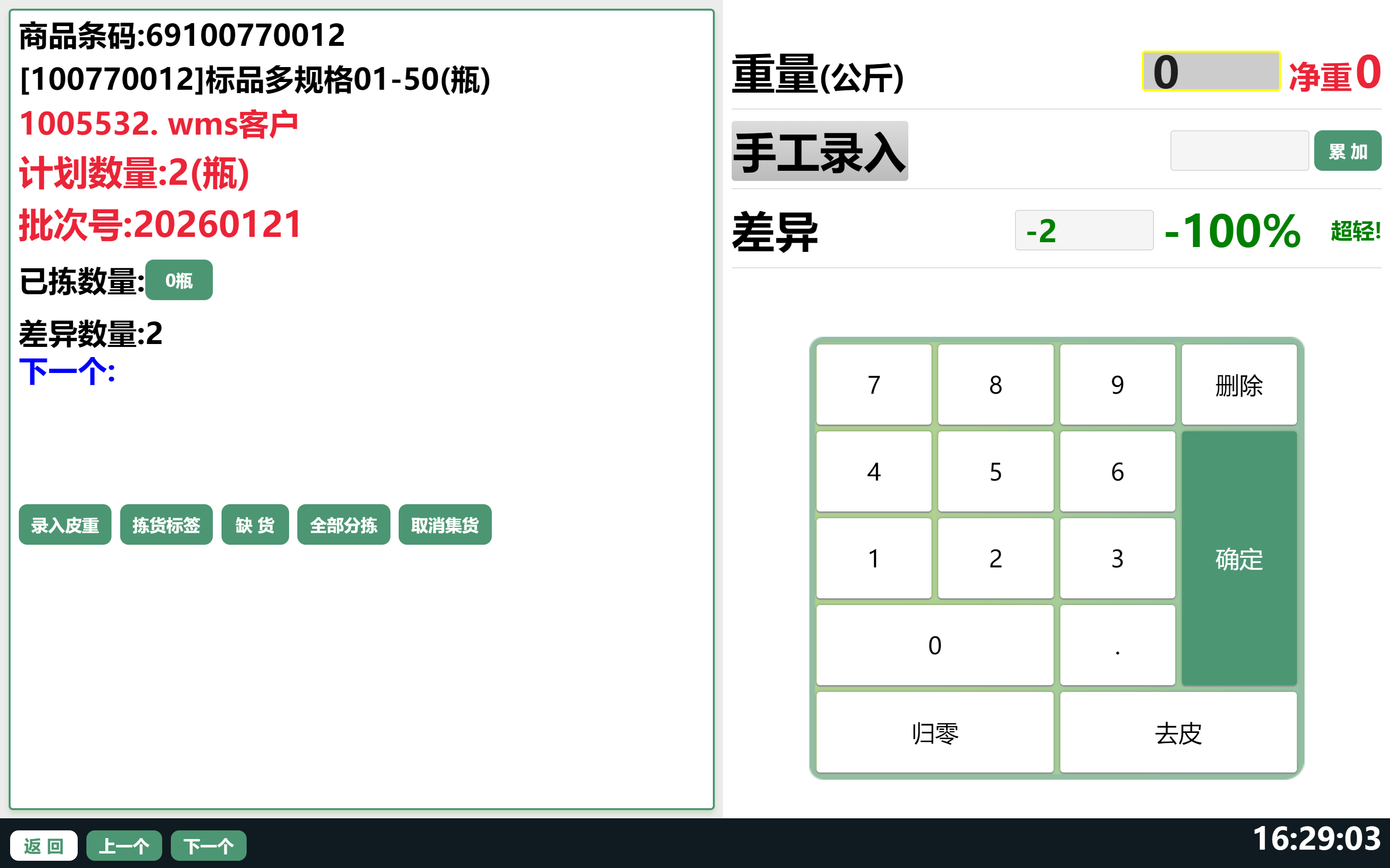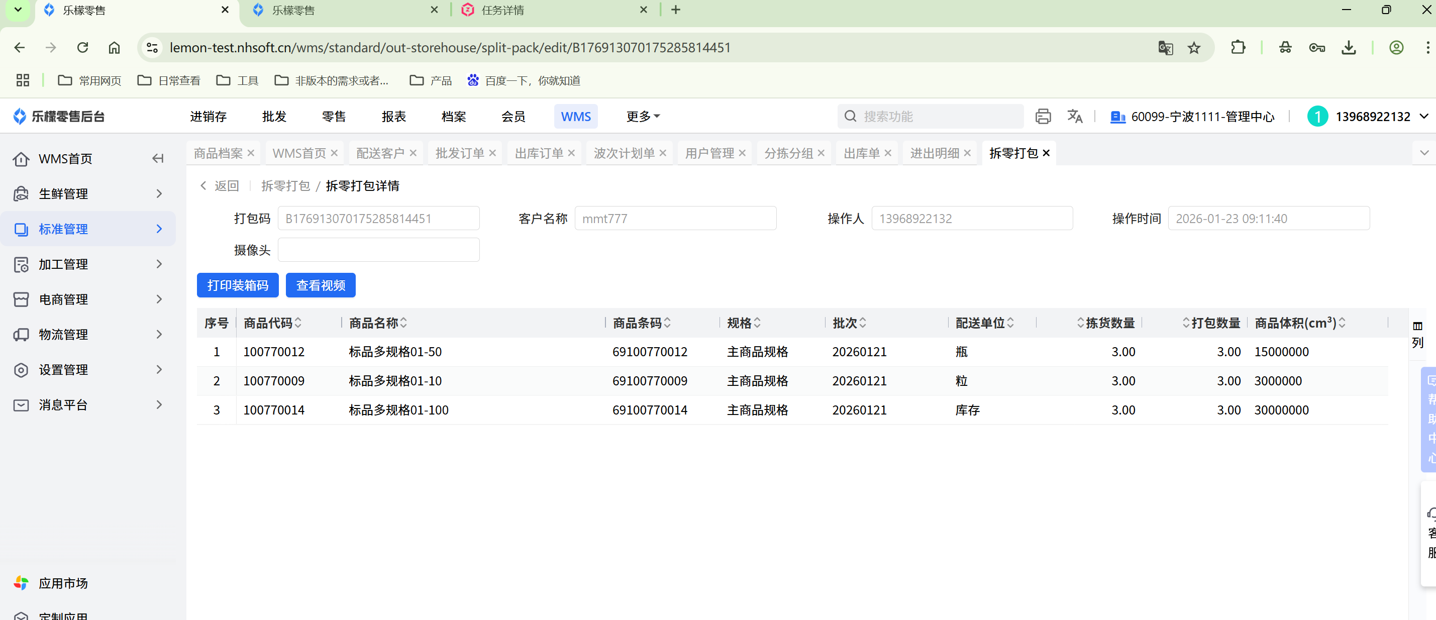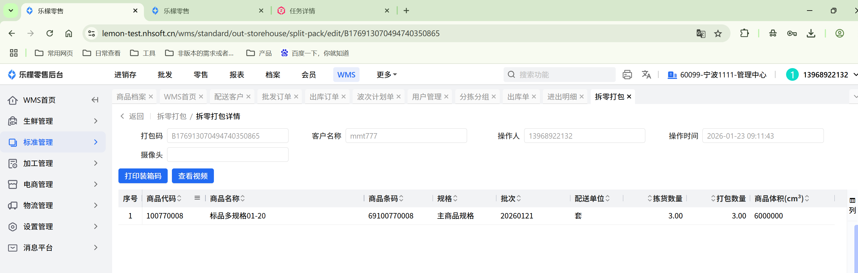 拆零打包操作:新WMS-标准管理-拆零打包-按订货规格完成打包、查看明细统计