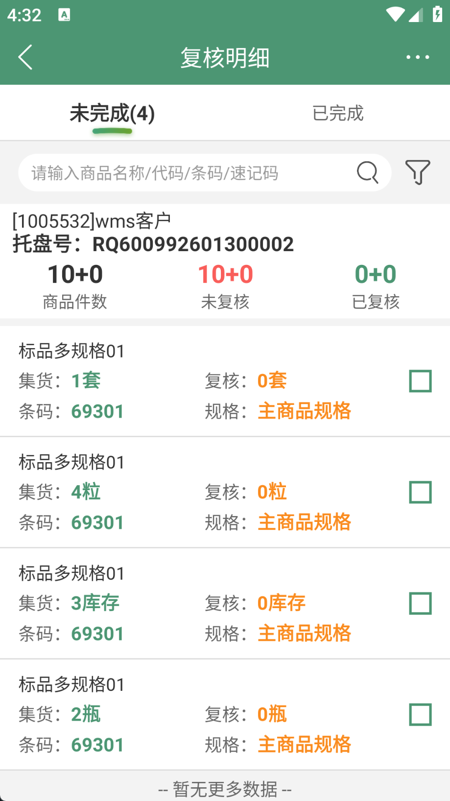 集货复核操作:新WMS-标准管理-集货复核-查看复核明细/汇总(按订货规格统计)