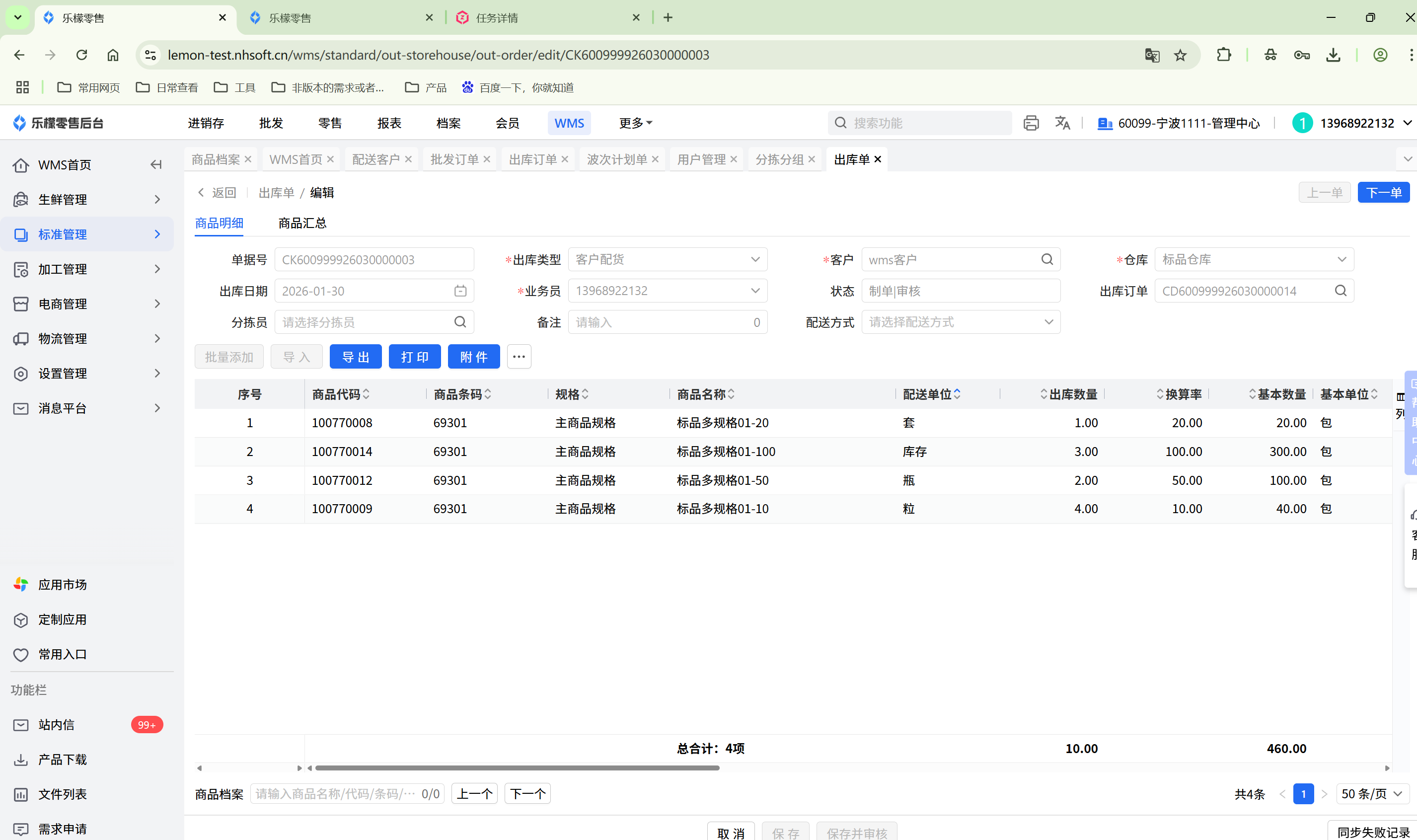 出库单操作:新WMS-标准管理-出库单(出库类型=客户配货,客户类型=新批发/新商贸)-按规则添加商品、完成出库及数据回传