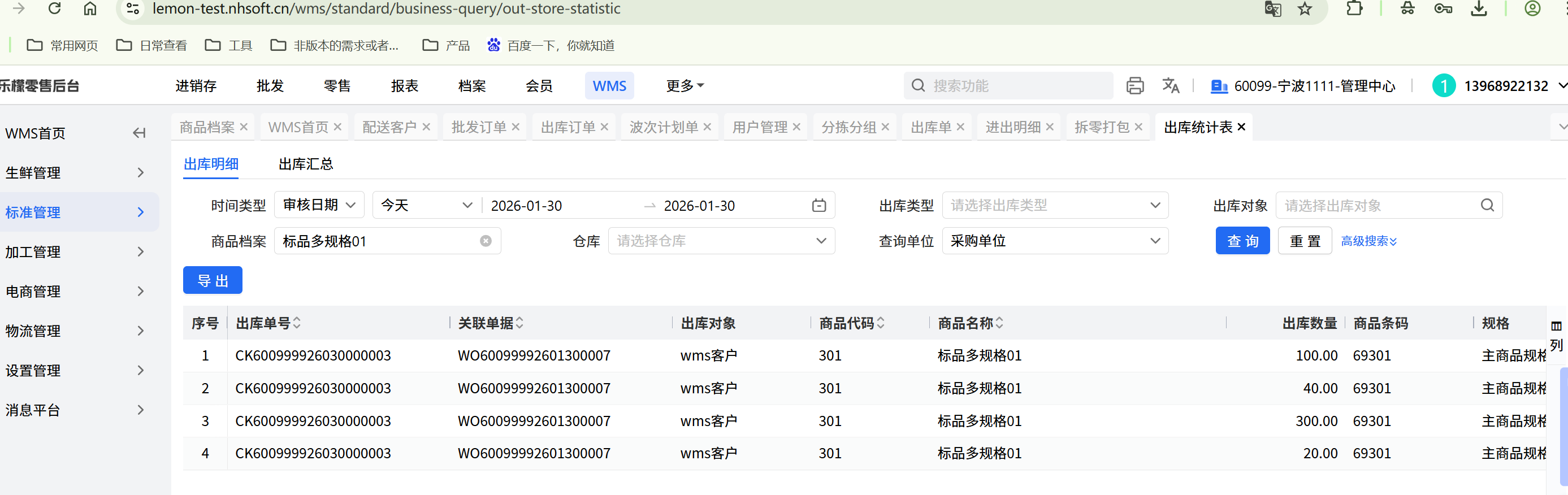 报表查看:新WMS-标准管理-出库统计表/ABC动态分析/拣货绩效-按查询条件查看统计数据(适配多规格统计规则)