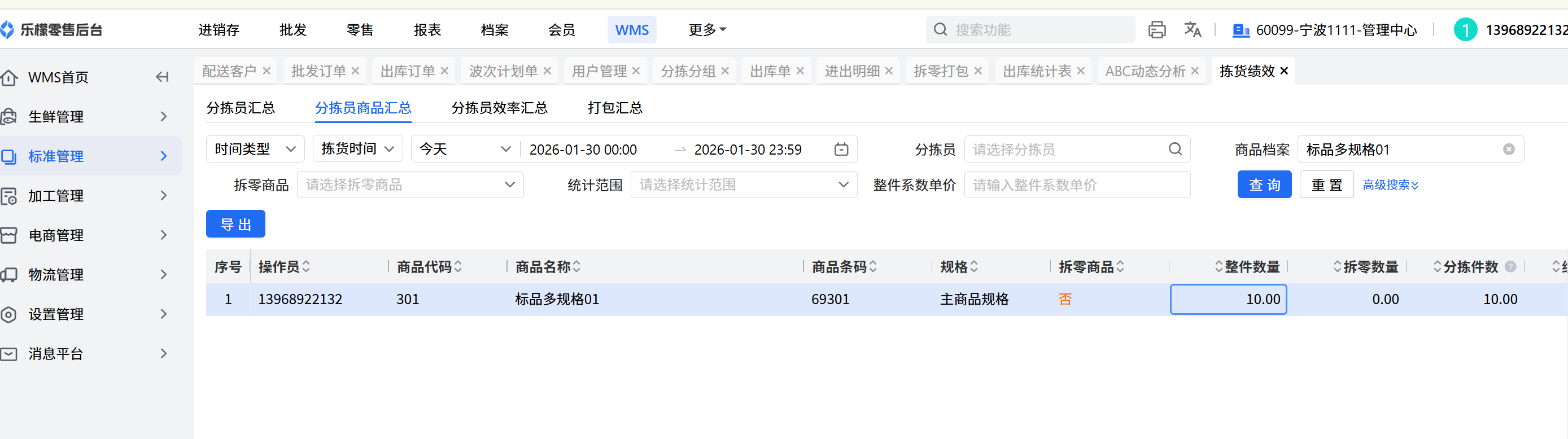 拆零与报表改造:优化拆零打包功能,按订货规格统计分拣、打包数据;优化出库统计表、ABC动态分析、拣货绩效等报表,实现多规格商品精准统计(明细分行、汇总合并),适配运营统计需求。