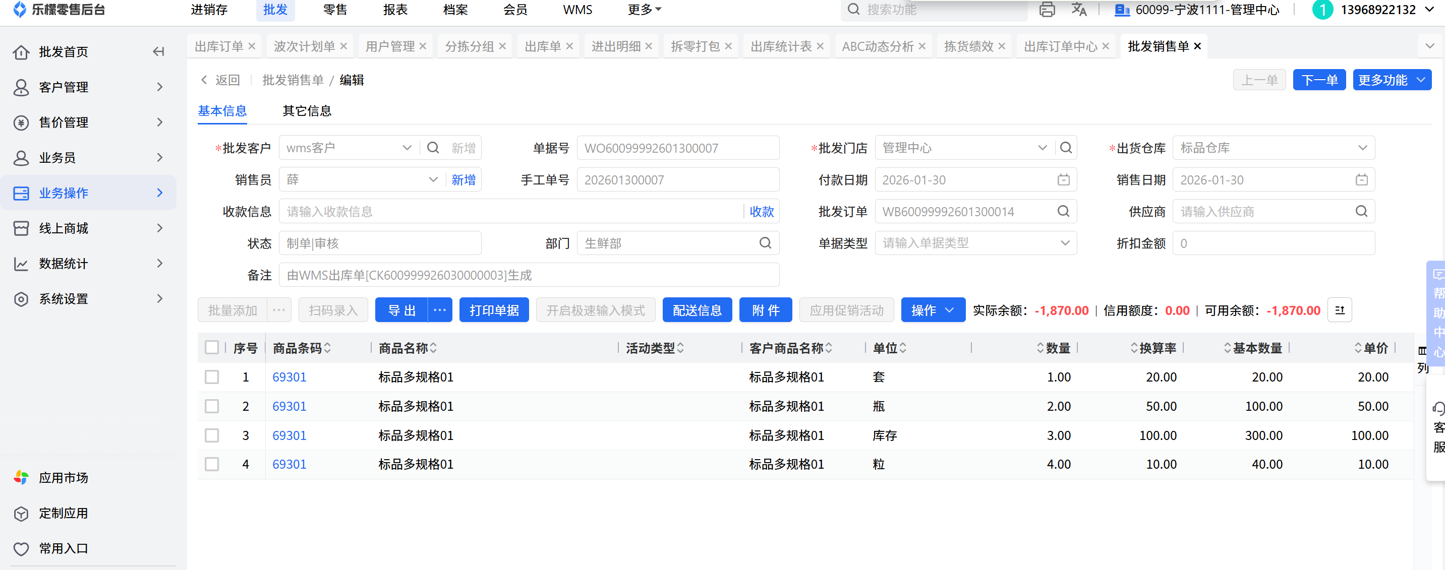 基础适配改造:商品中心规格管理增加“WMS”应用范围,仅勾选该范围的规格同步至WMS商品;WMS商品明细界面新增订货规格及“规格商品”标记,配送客户管理新增二级类型,实现客户类型精准适配。