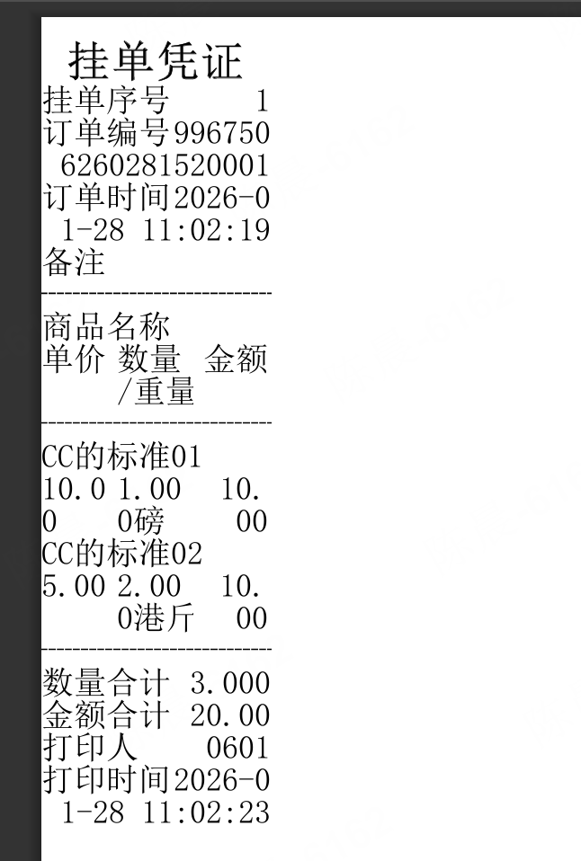 应用:当参数开启时,前台收银界面每次点击挂单按钮时,将当前单据进行票据打印,模版固定