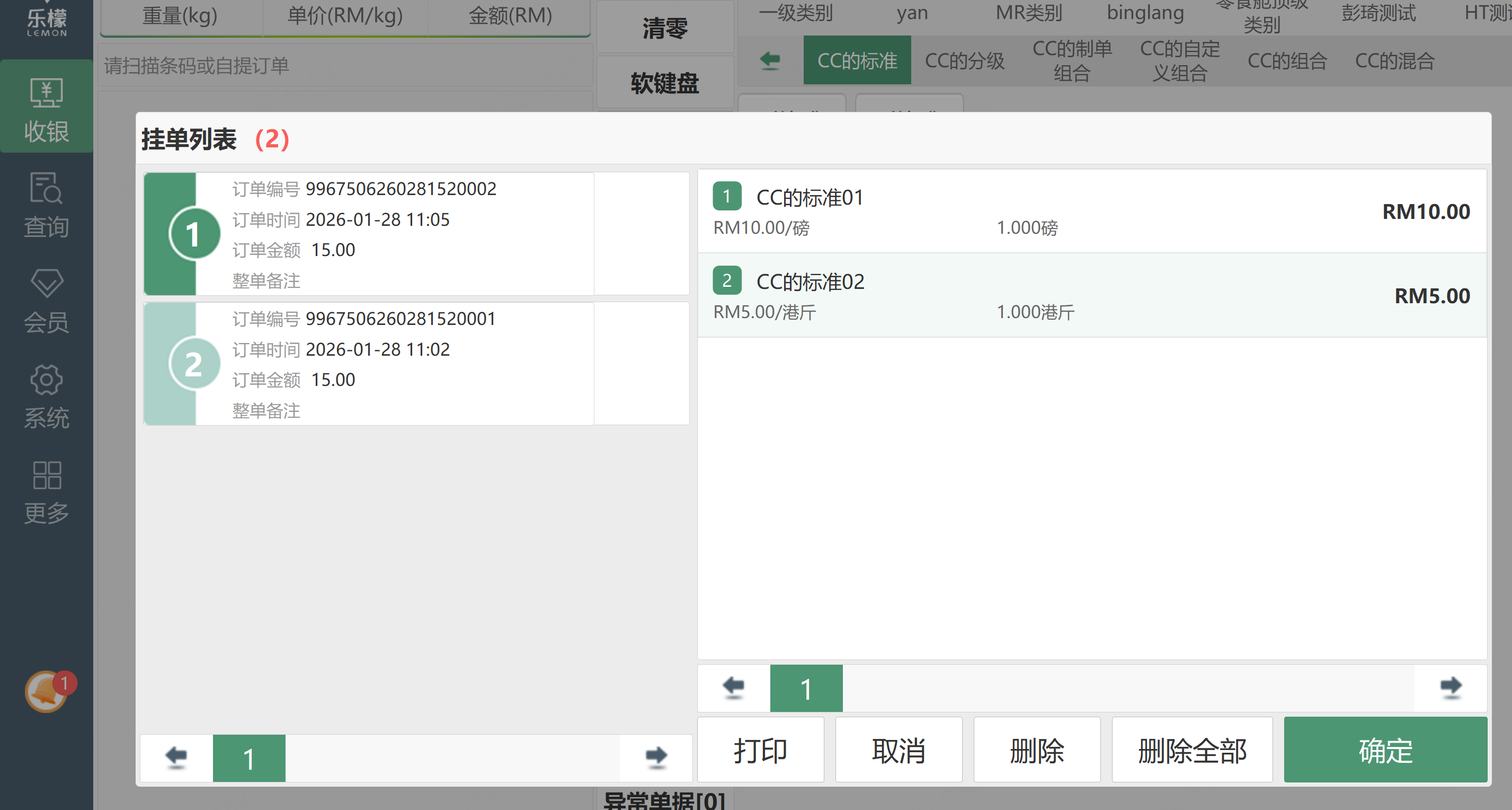 常规挂单模式界面下,新增打印按钮,使用固定模版将当前挂单中的单据进行打印
