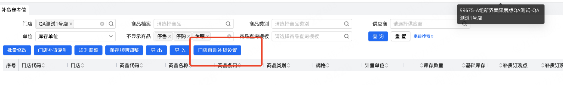 按钮“门店自动补货设置”,显隐规则改为取消仅当前登录门店=管理中心才显示的逻辑