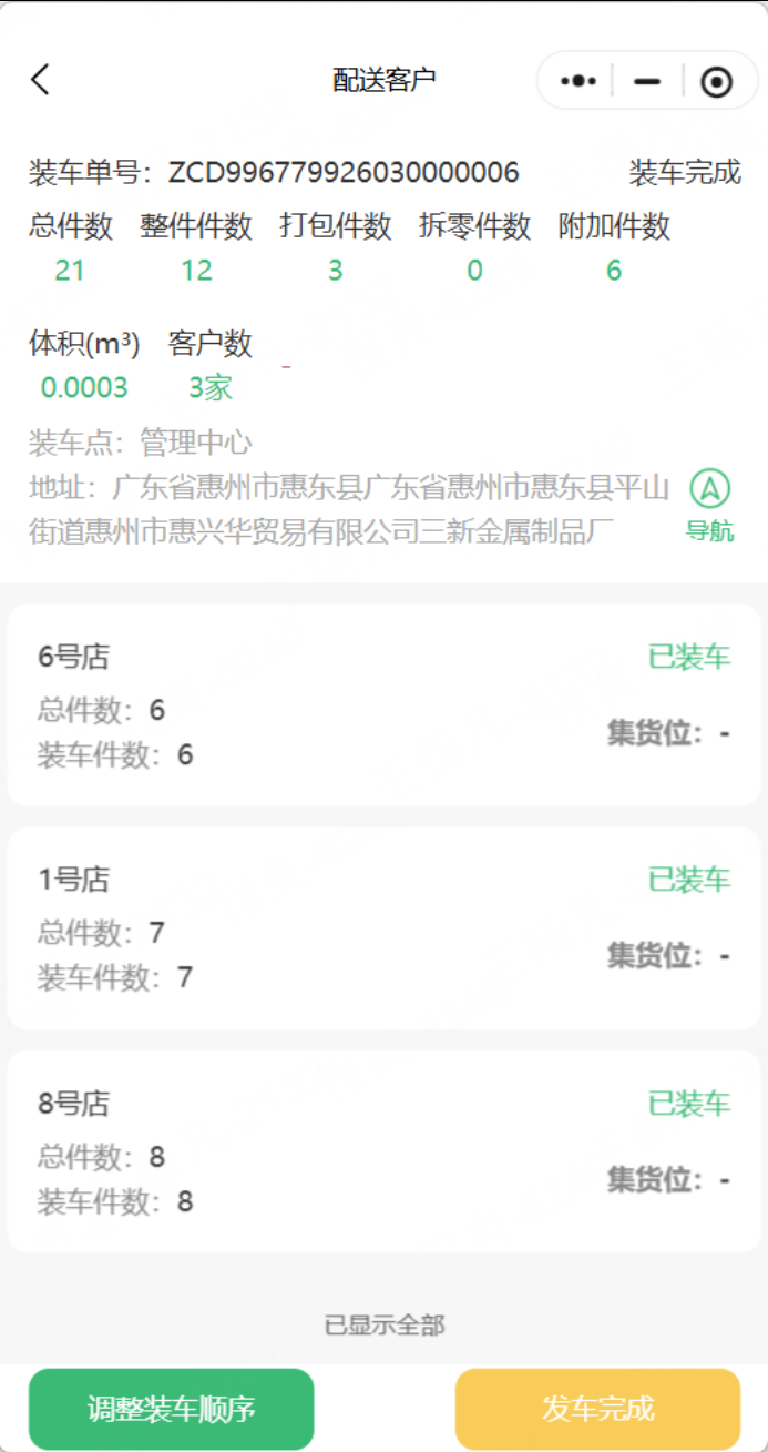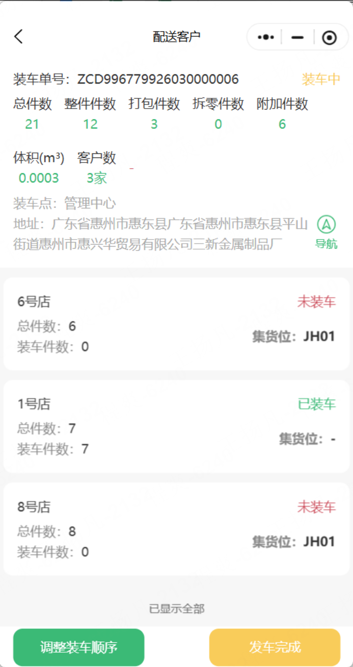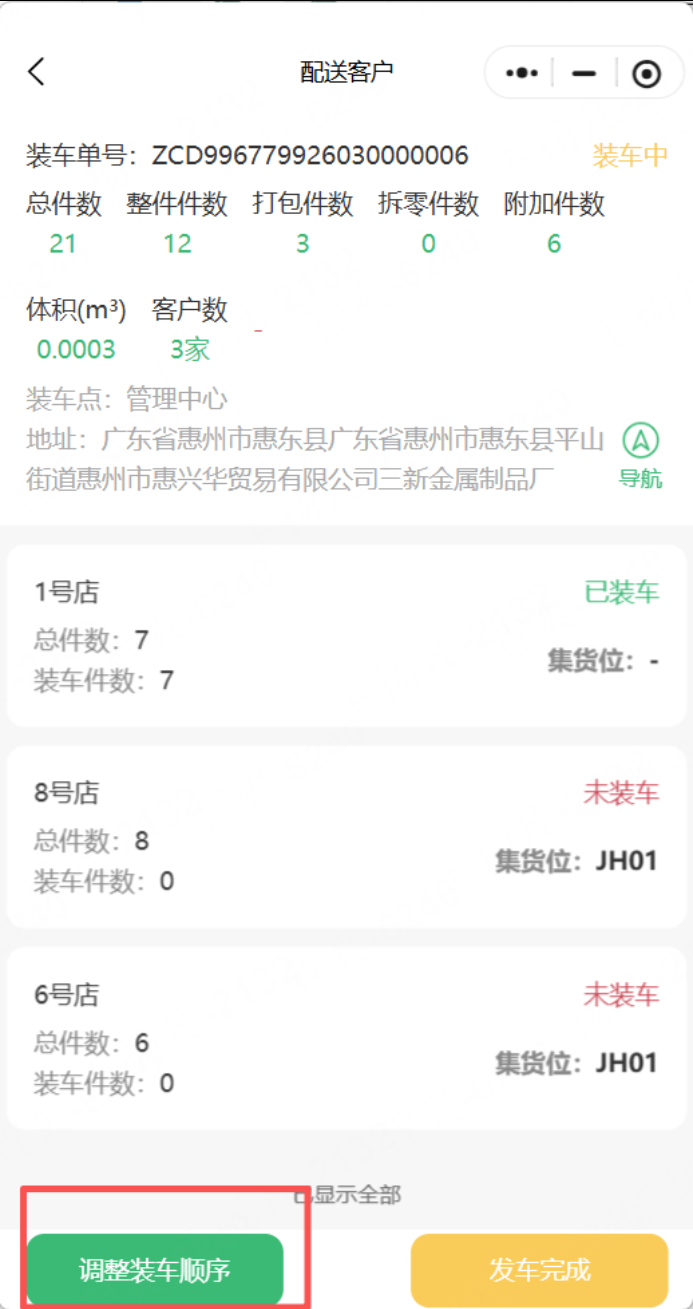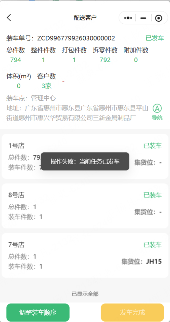 仅装车状态为“未发车”的任务可调整配送顺序,已发车任务点击“调整装车顺序”会提示失败,无法操作。