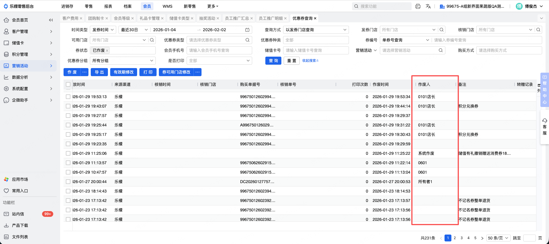 POS前台营销活动/储值有礼等活动发券:因为反结账/整单退货/反储值等行为导致活动发放的券作废,作废人记录为:操作时当前POS登录员工姓名