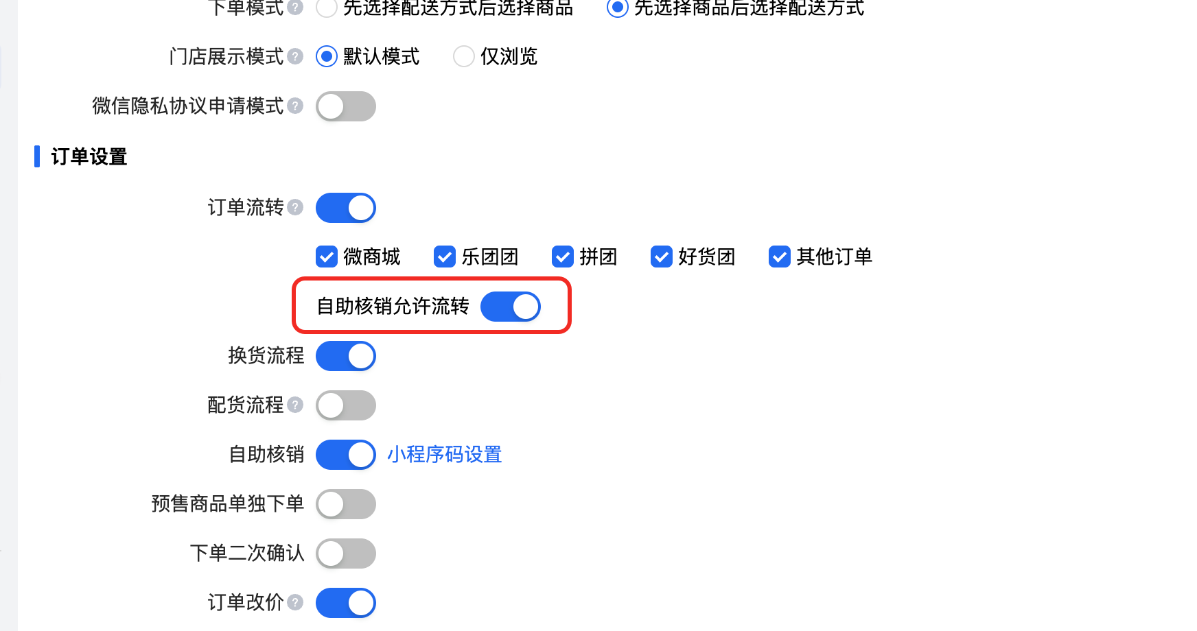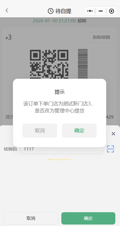 自助核销支持订单流转,功能启用后,如果用户扫码的核销码不是下单门店的核销码,提示用户是否要改为当前门店提货,确定后订单流转到当前门店并支持自助核销。