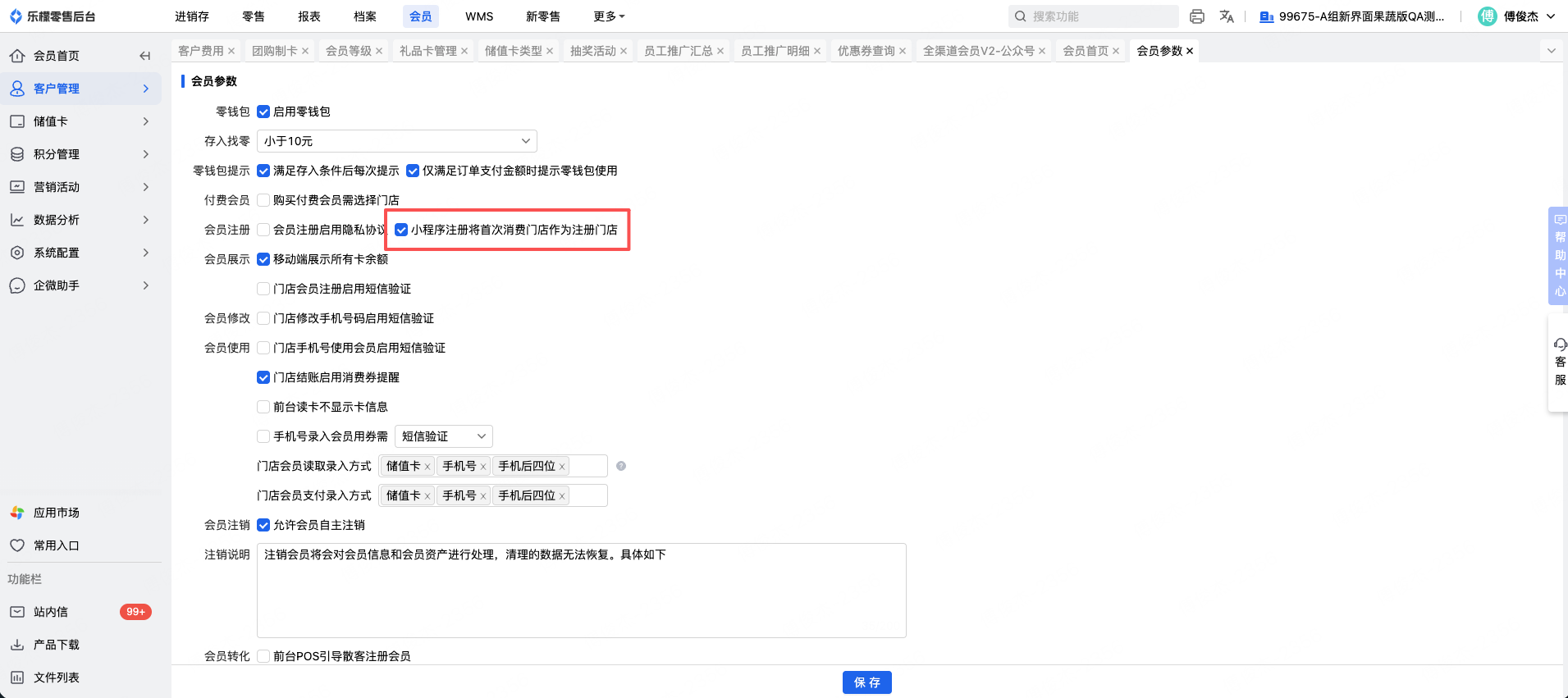 全渠道会员-新增参数「小程序注册将首次消费门店作为注册门店」