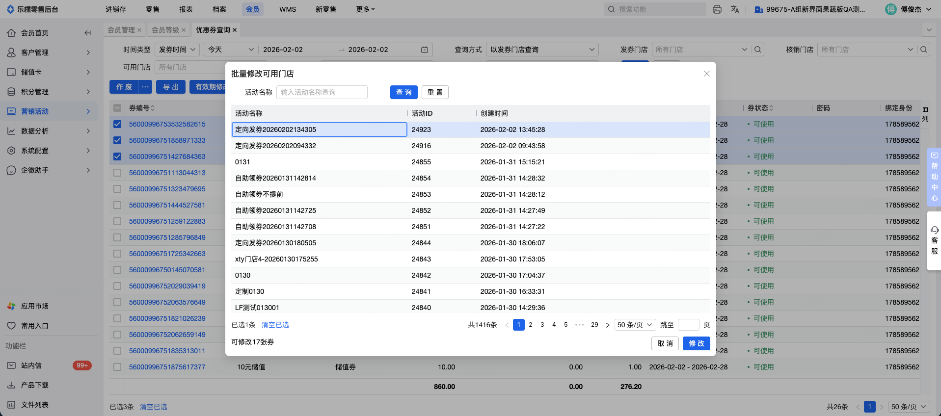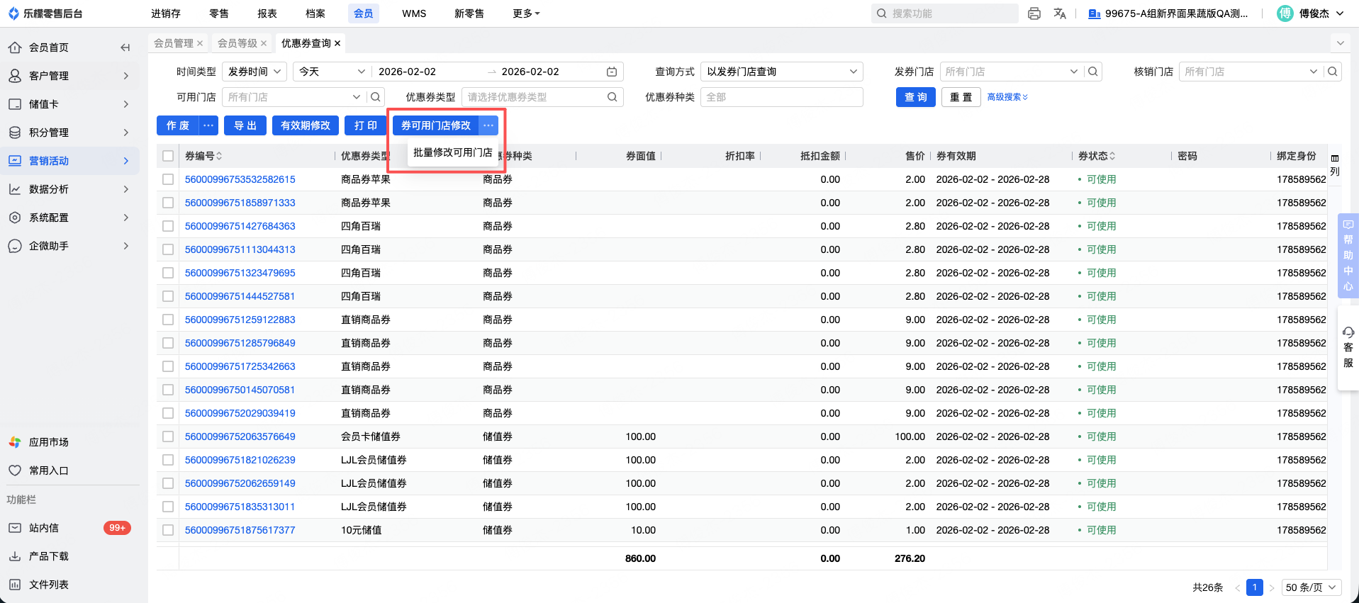 全渠道会员-优惠券查询,新增「券可用门店修改」按钮