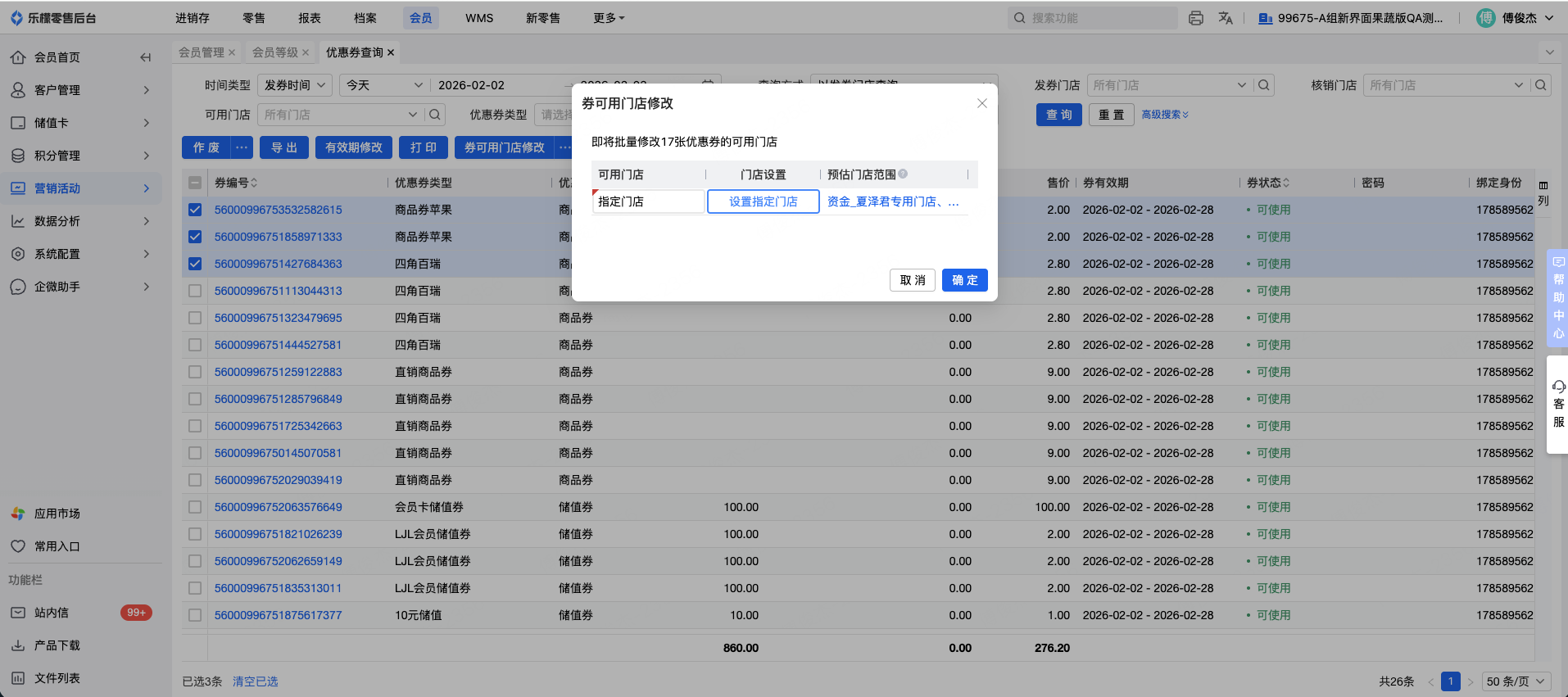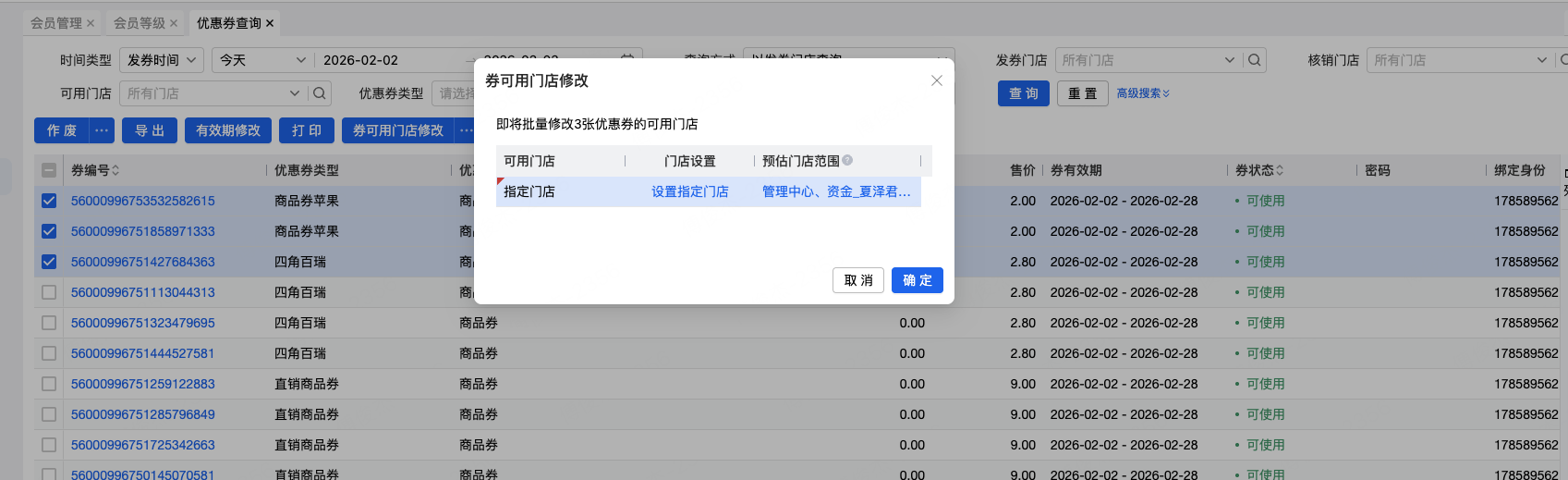 1、勾选列表的优惠券后,点击「券可用门店修改」按钮,在弹窗中重新选择券可用门店,点击「确认」按钮后,列表中选择的优惠券的可用门店将全部替换为当前新设置的门店