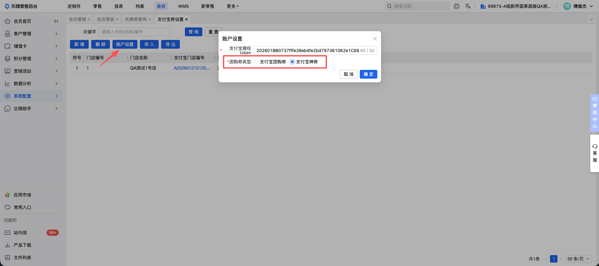 2、获取到token后,前往会员-系统设置-支付宝券设置中,点击「账户设置」按钮,将团购券类型切换为「支付宝神券」,同时将新获取的支付宝授权token填入上方输入栏中