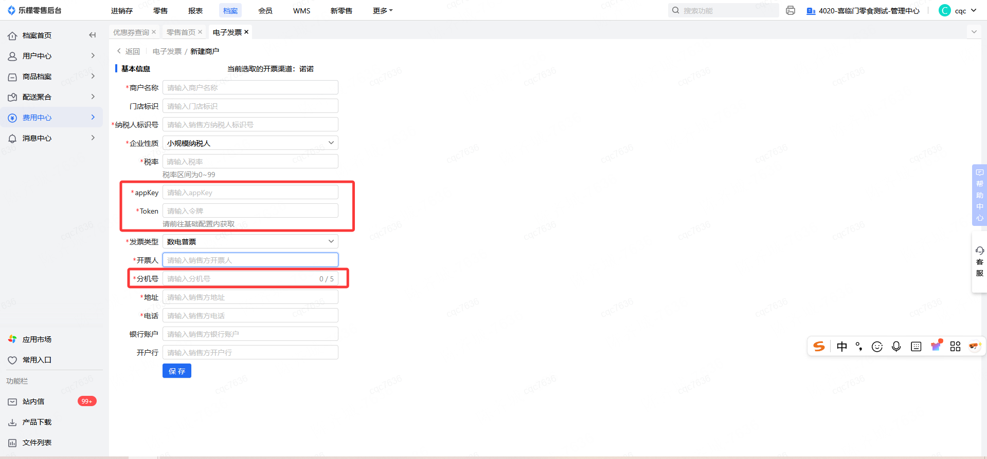 2.开票商户里新增商户,正常填写商户信息以及上面的appkey、Token等,这里主要说下发票类型、分机号