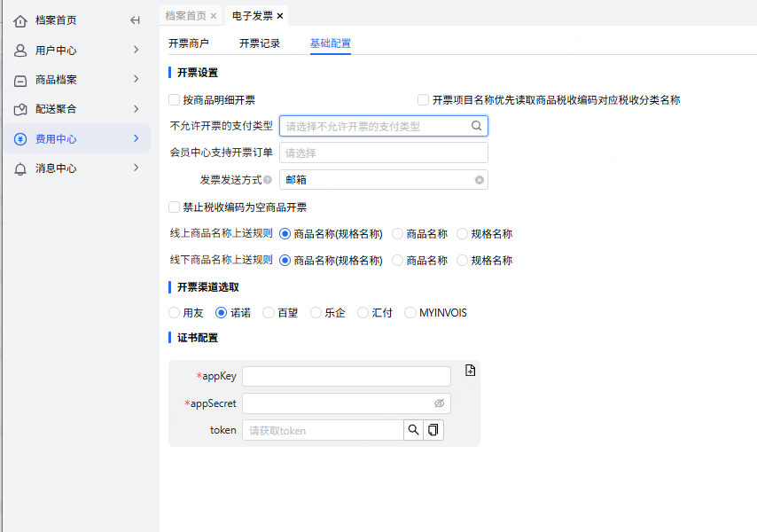 1.先要基础配置里设置好开票渠道-诺诺,填写好提供的APP Key、APP Secret,token可自动获取