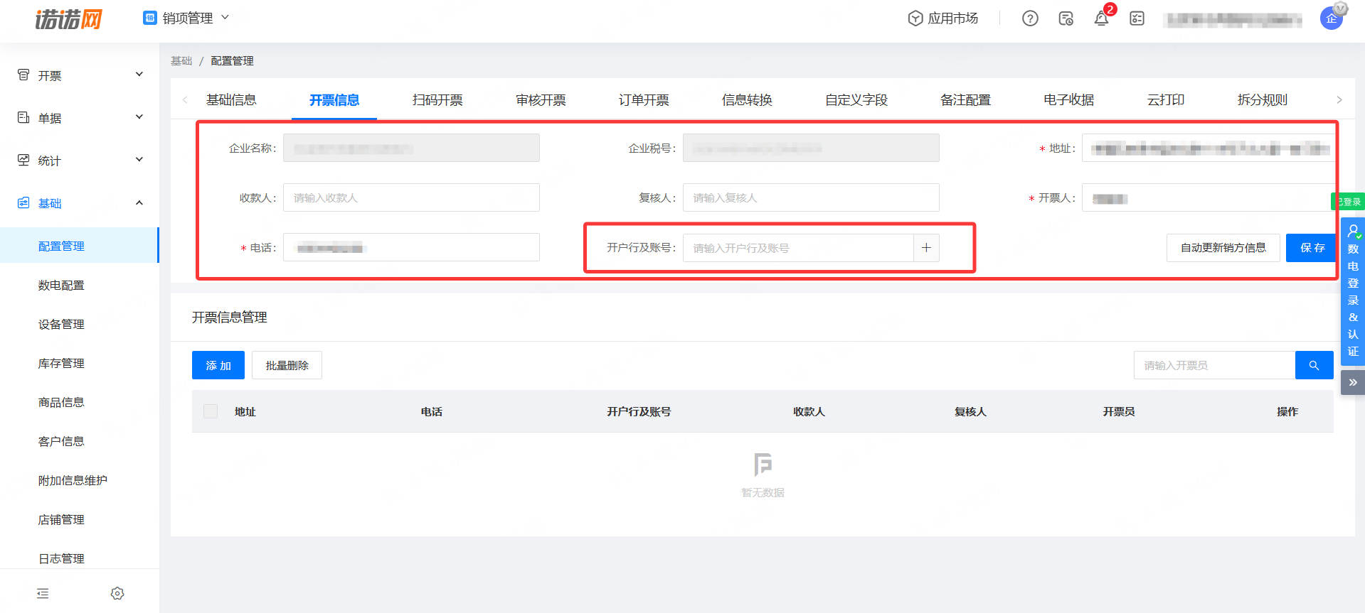 4.商家要维护下诺税通平台(网址https://nst.nuonuo.com/#/)的开票信息开户行等
