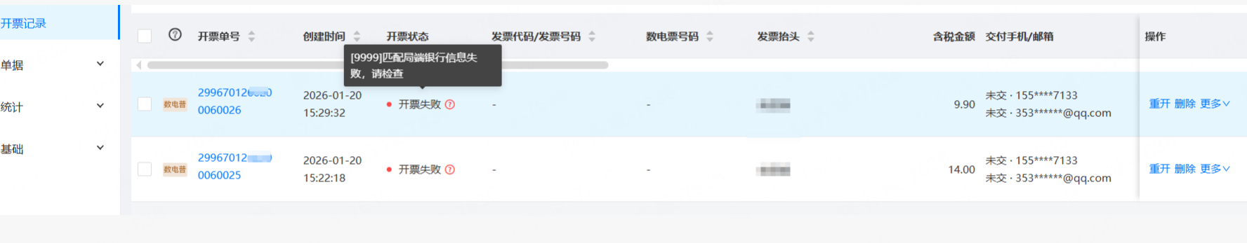 平台后台的基础-配置管理里开票信息,这个页面信息都要填写下,尤其开户行和账号,不然开票会提示【9999】匹配局端银行信息失败,请检查