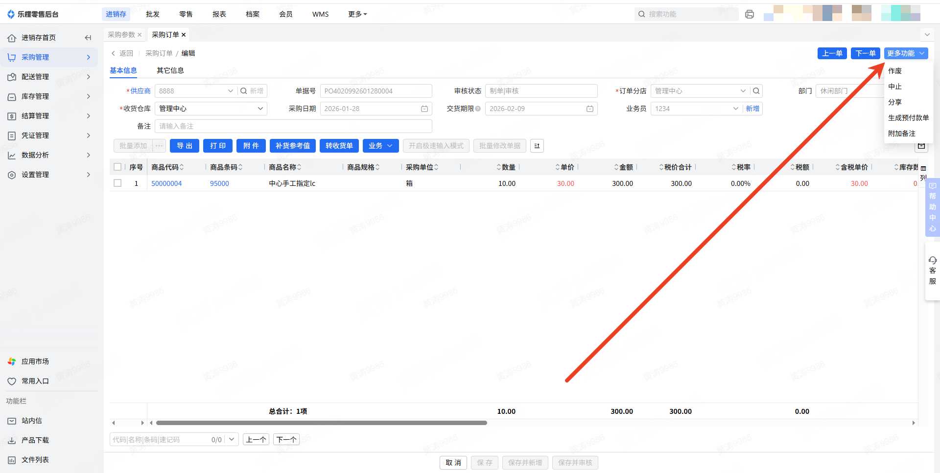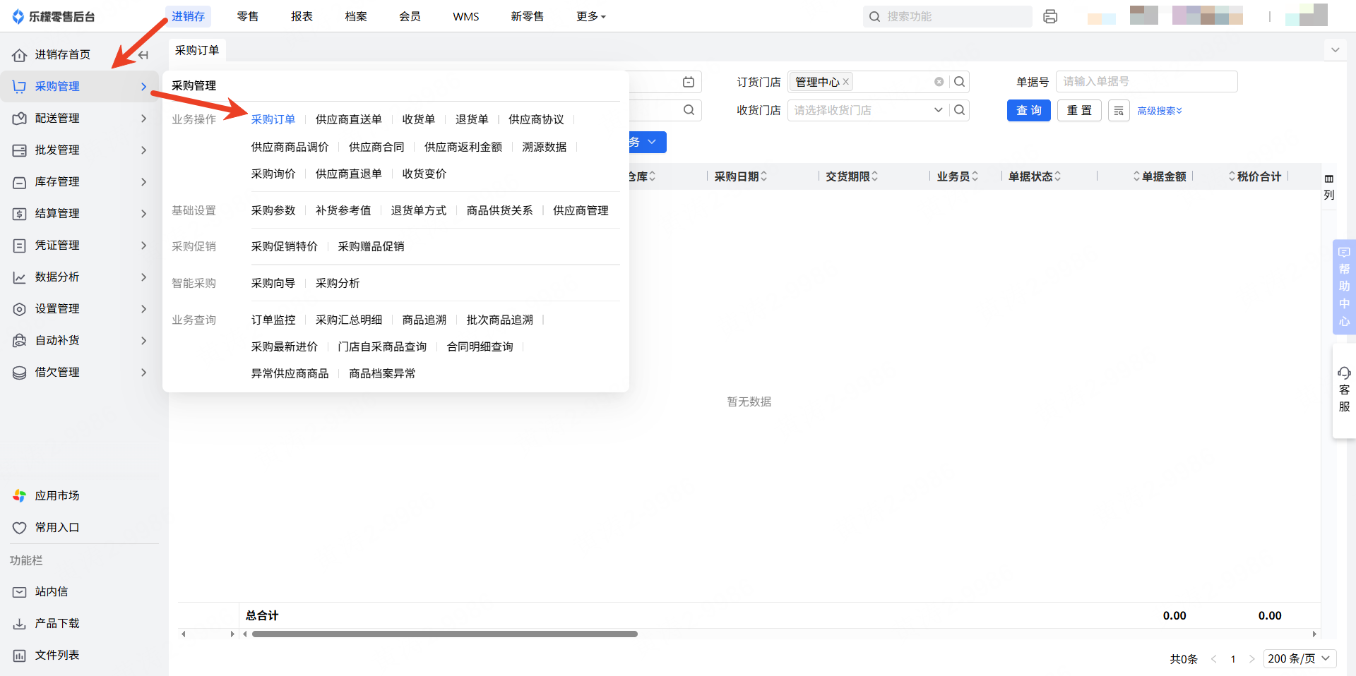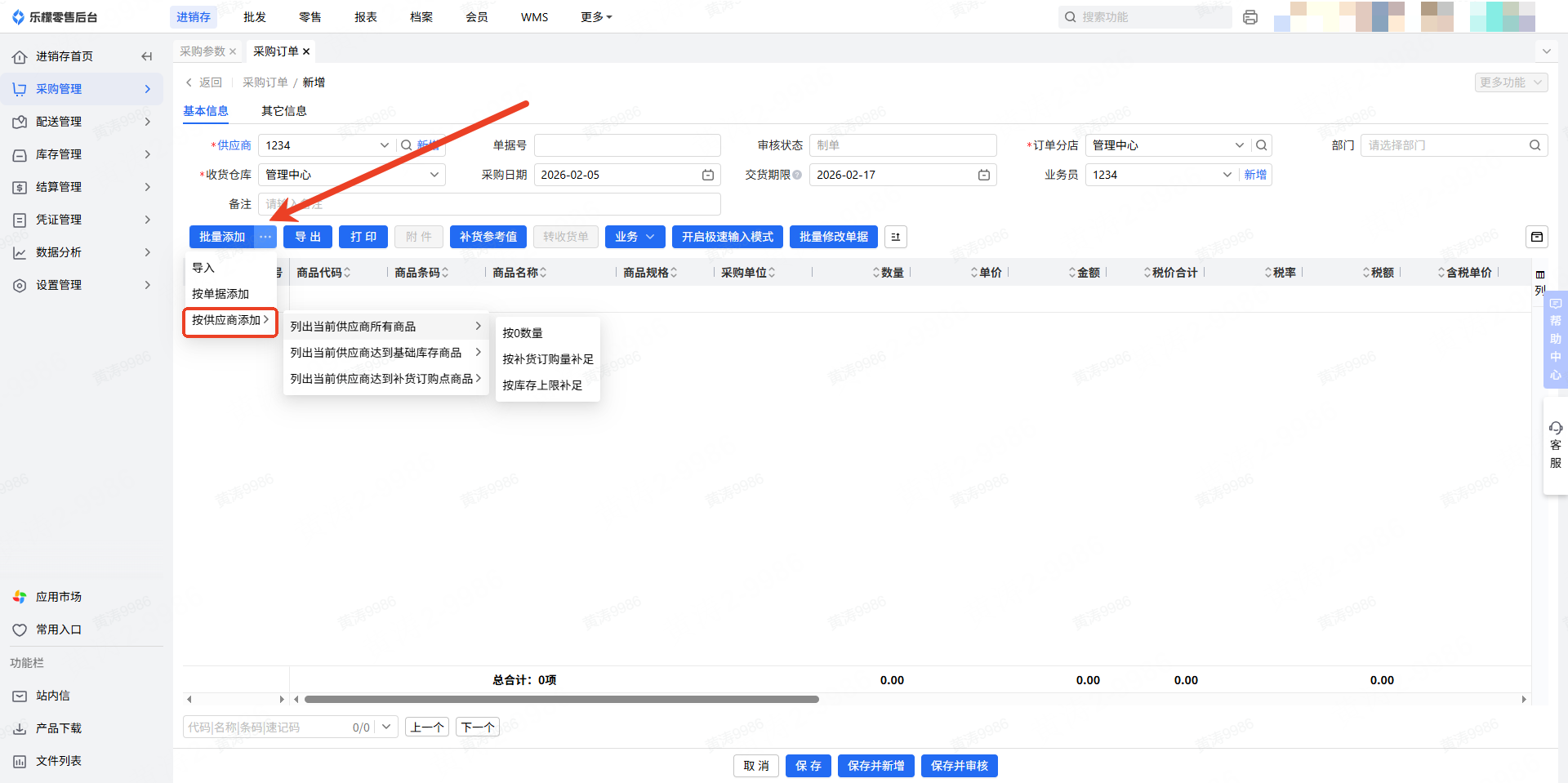 👉【操作路径】:1.进销存—采购管理—采购订单
