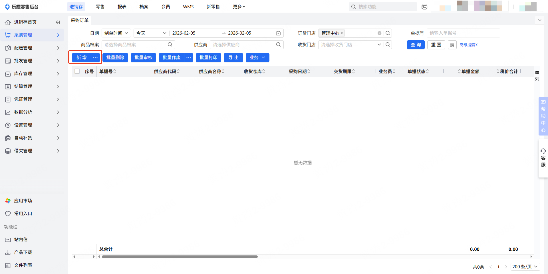 批量制单 | 点击「新增」按钮右侧的「・・・」图标,适合同一供应商下,多家门店同时创建采购订单的场景 |