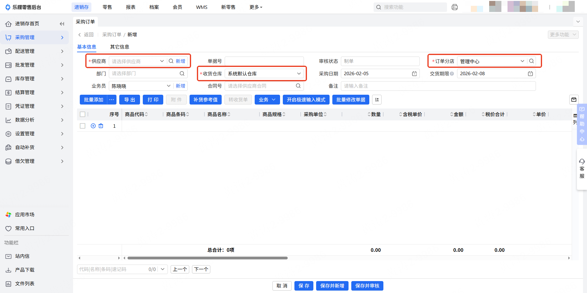 保存并新增:保存当前单据,同时新增一张空白采购订单,新单据均可后续修改