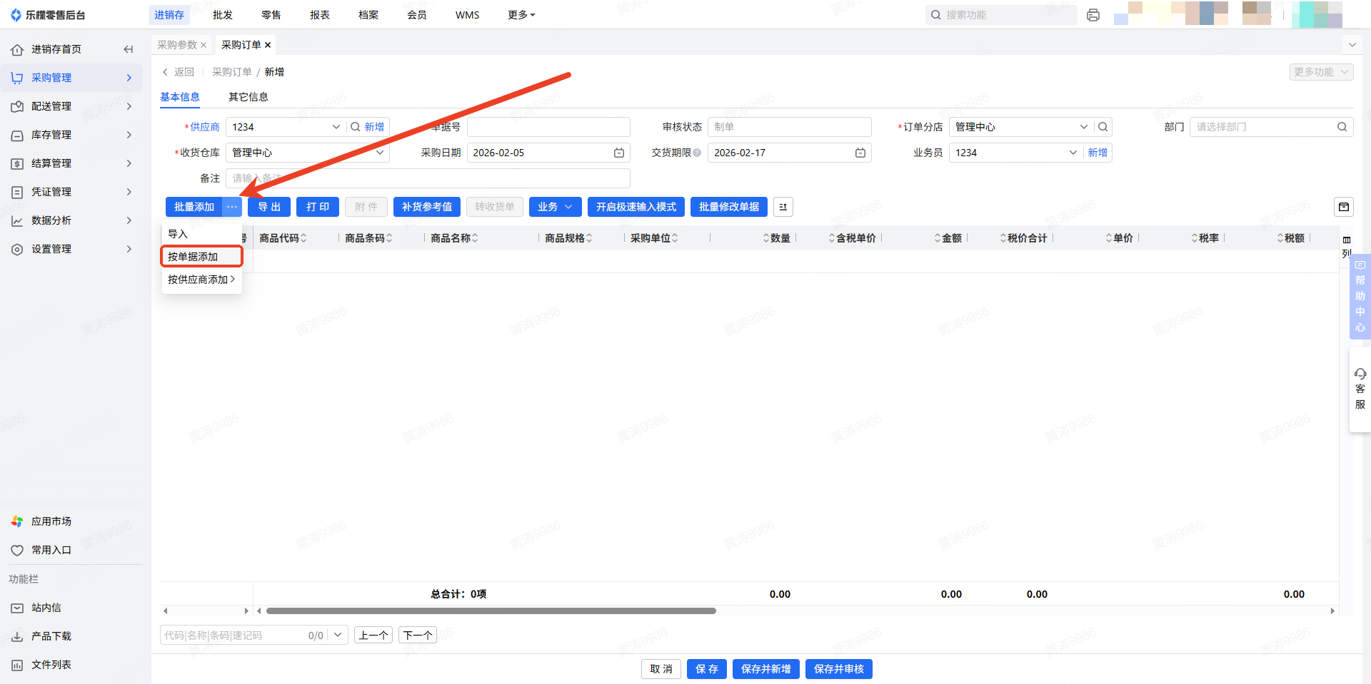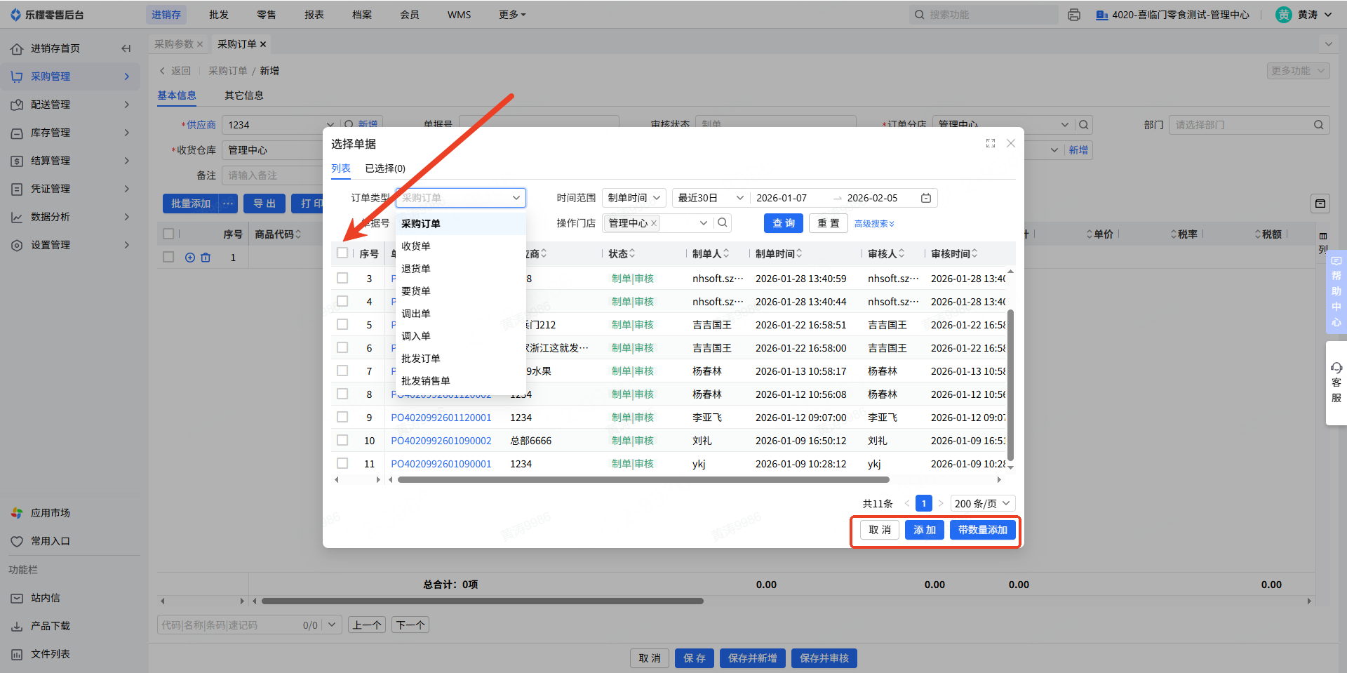 (4)支持按单据添加商品明细:可引用系统内要货单、批发订单、采购订单、收货单、退货单等单据生成明细,选择对应订单类型并找到目标单据后勾选,点击「添加」(仅导入商品,不带数量)或「带数量添加」(同步原始单据商品数量),即可将单据内商品明细导入至当前采购订单