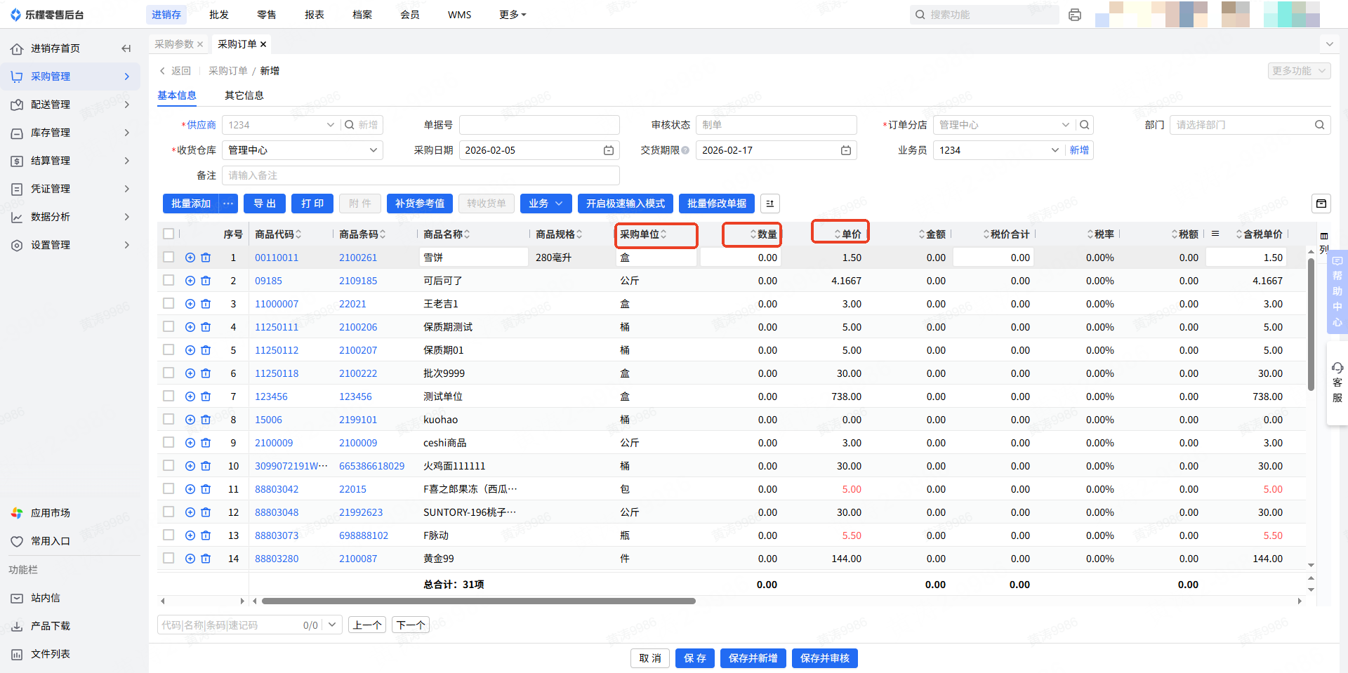 4.添加好相应采购商品后,填写需要采购的数量、采购单价以及采购单位。注意这三点需要对应