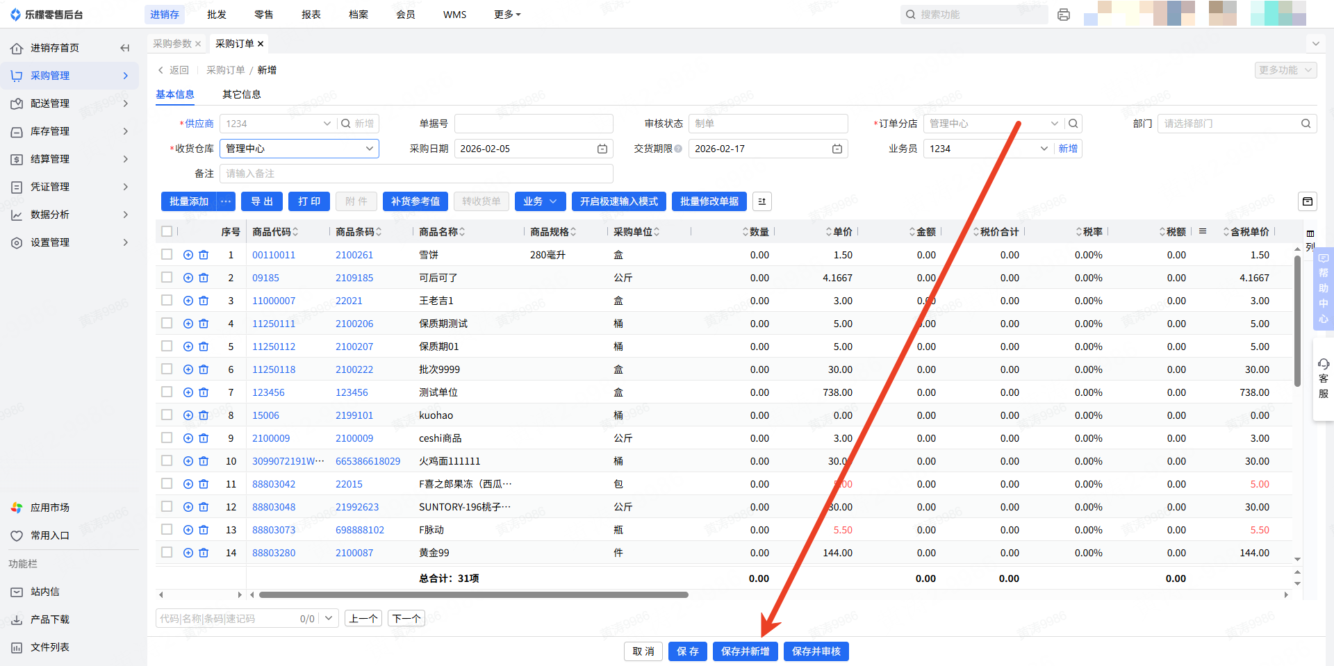 5.全部商品录入完成后,可进行保存或者审核处理。