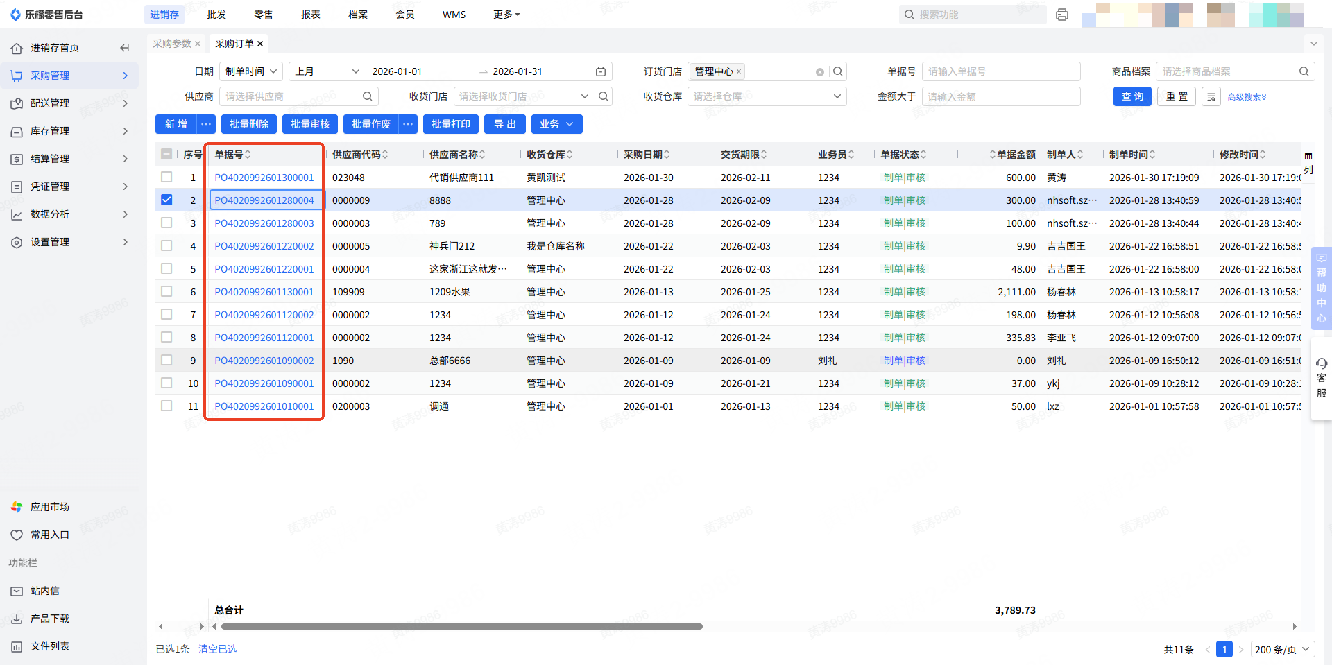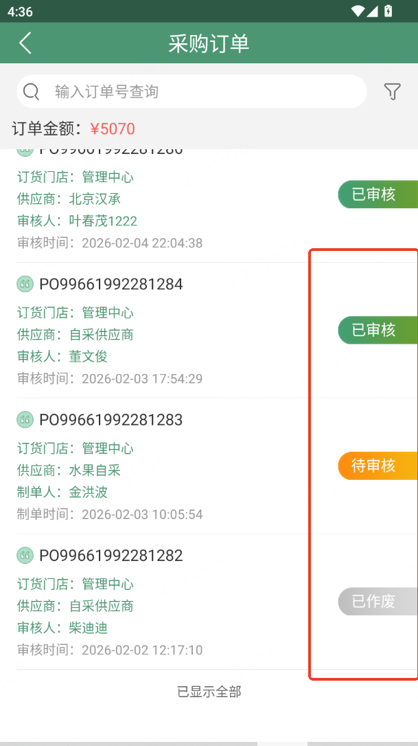 采购订单列表支持查看单据状态、单据号、订货门店、供应商、制单 / 审核人、制单 / 审核时间等核心信息。