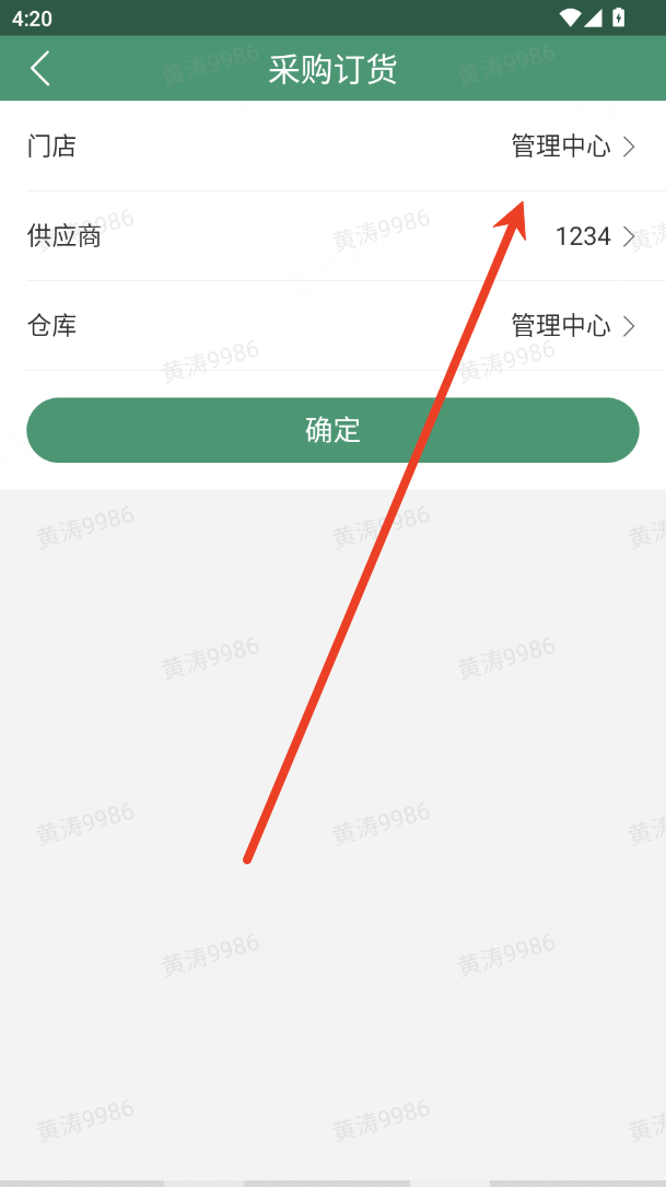 1.点击采购订货,选择对应门店(默认为当前账户所登录的门店)、供应商、仓库,然后点击确定