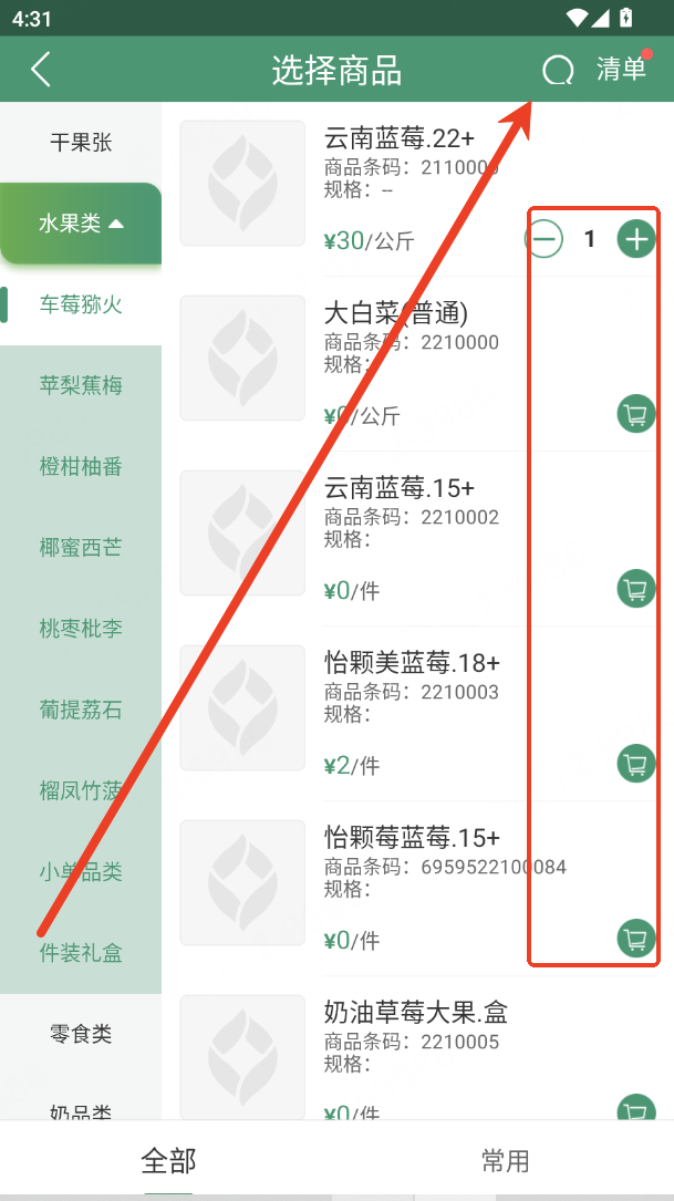 2.进入商品列表页,可通过右上角🔍搜索商品名称、条码、代码,或从左侧商品分类中查找目标商品;点击商品右下角购物车图标,即可将商品添加至清单。