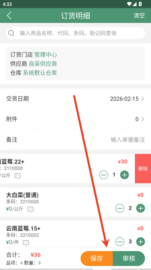 3.商品添加完成后,点击右上角「清单」按钮可查看订货明细;如需删除单款商品,左滑该商品并点击删除即可,若需清空所有商品,直接点击界面右上角「清空」按钮。确认订货信息无误后,点击「审核」完成下单;若暂未完成编辑,可先点击「保存」,后续可再次进入编辑。