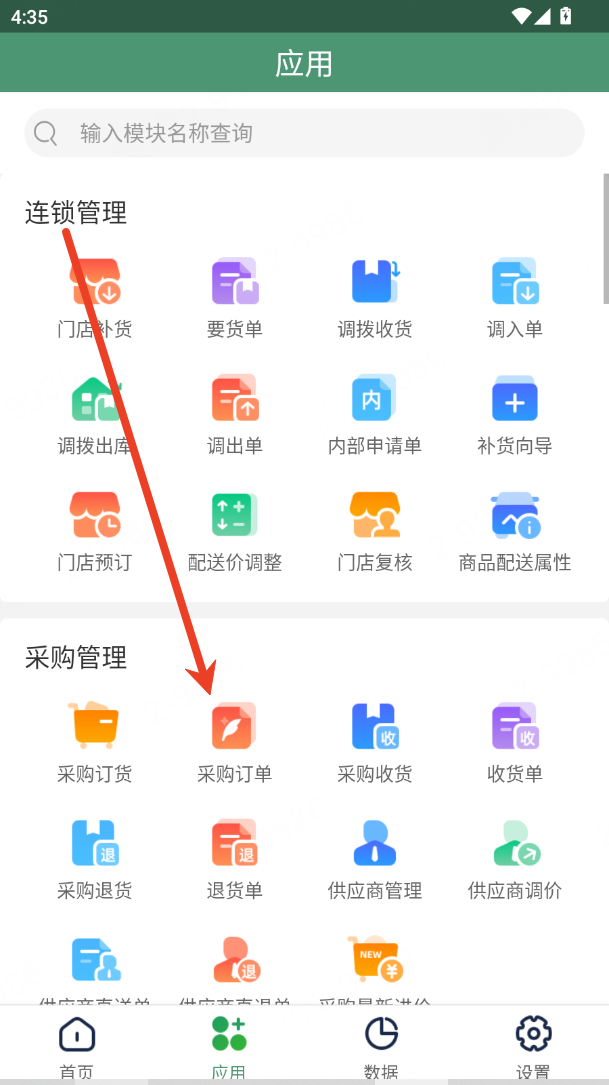👉【操作路径】:1.乐檬零售app—应用—采购管理—采购订货—新增