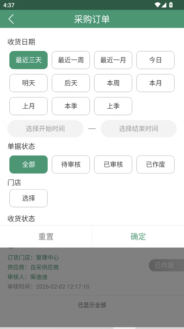 已审核:单据审核完成,不可编辑修改;若未执行收货操作,可进行作废处理;