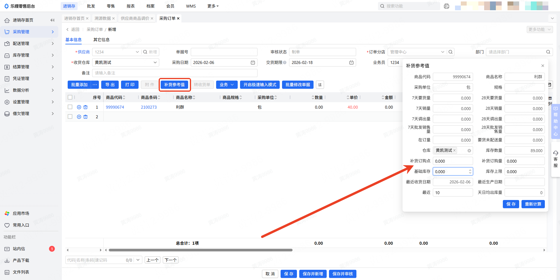 (6)补货参考值:是用于辅助采购人员判断采购量。采购在做订单的时候都会看补货参考值,如果是新品没有设置补货订购点,补货订购量,还需要再到补货参考值里去找这些品去设置,比较麻烦,所以在采购订单中可以维护这些信息。