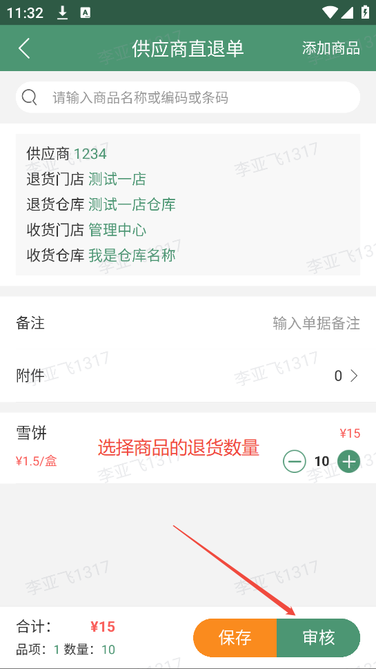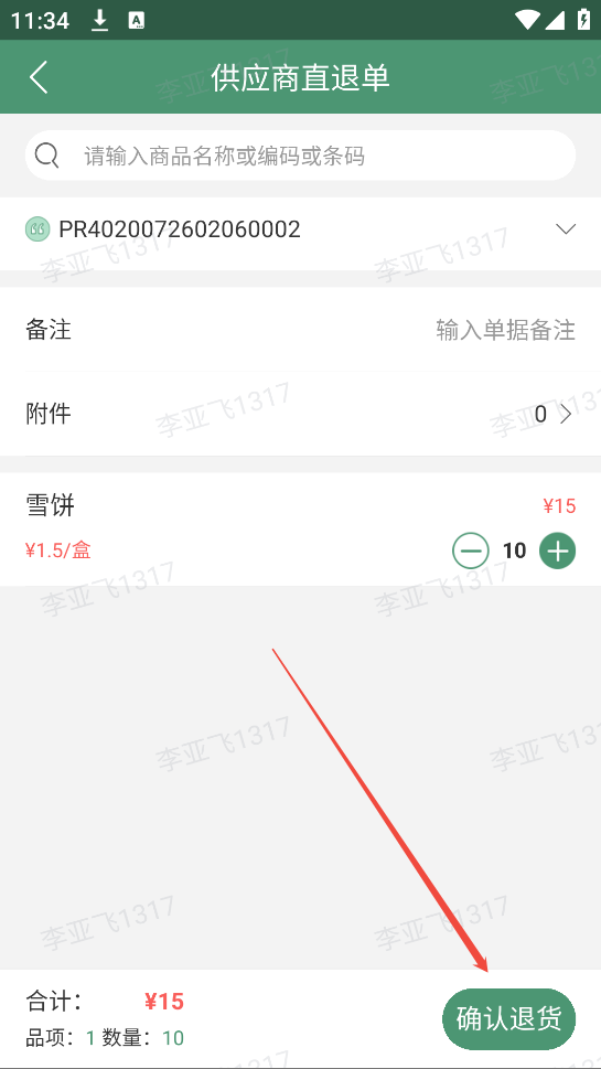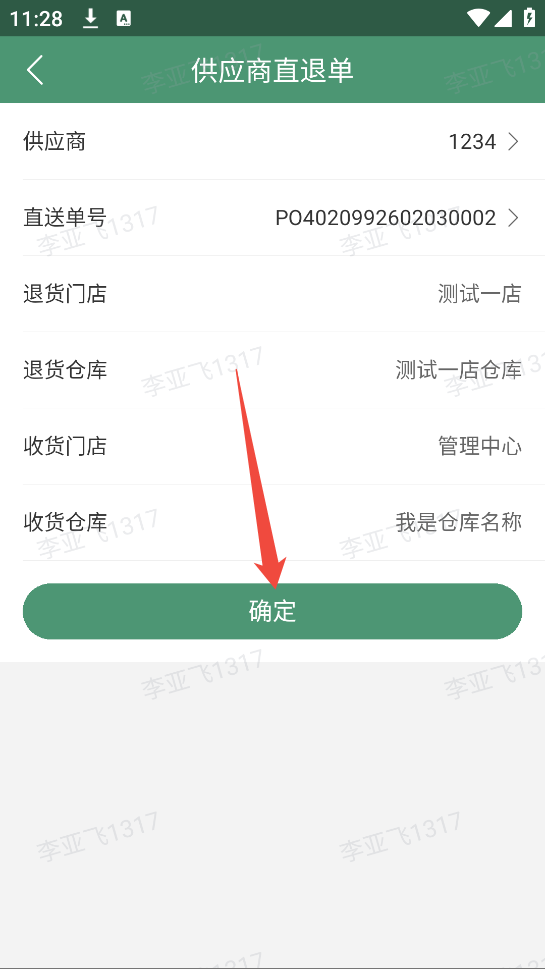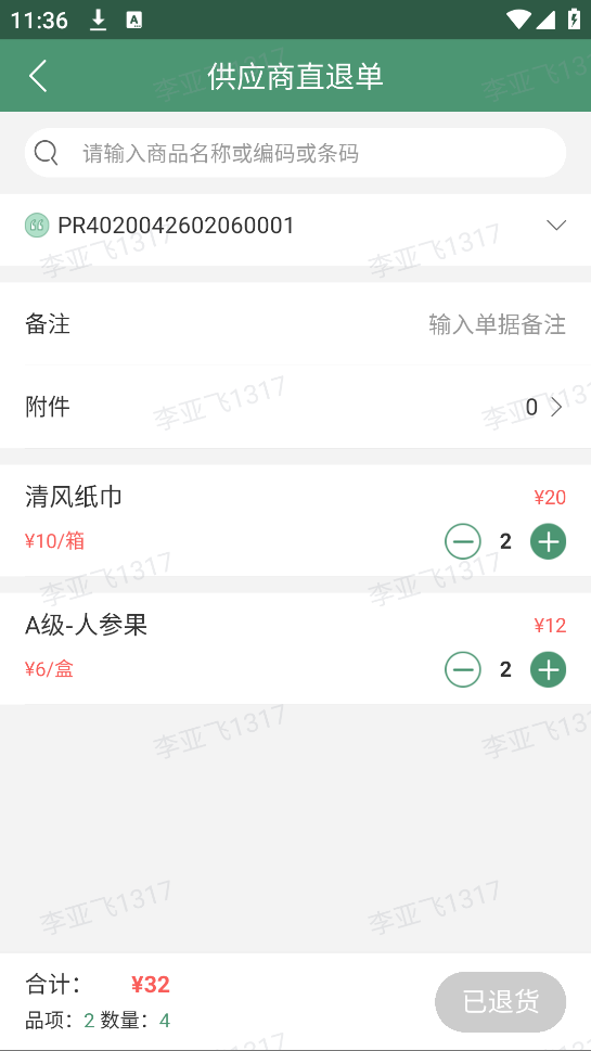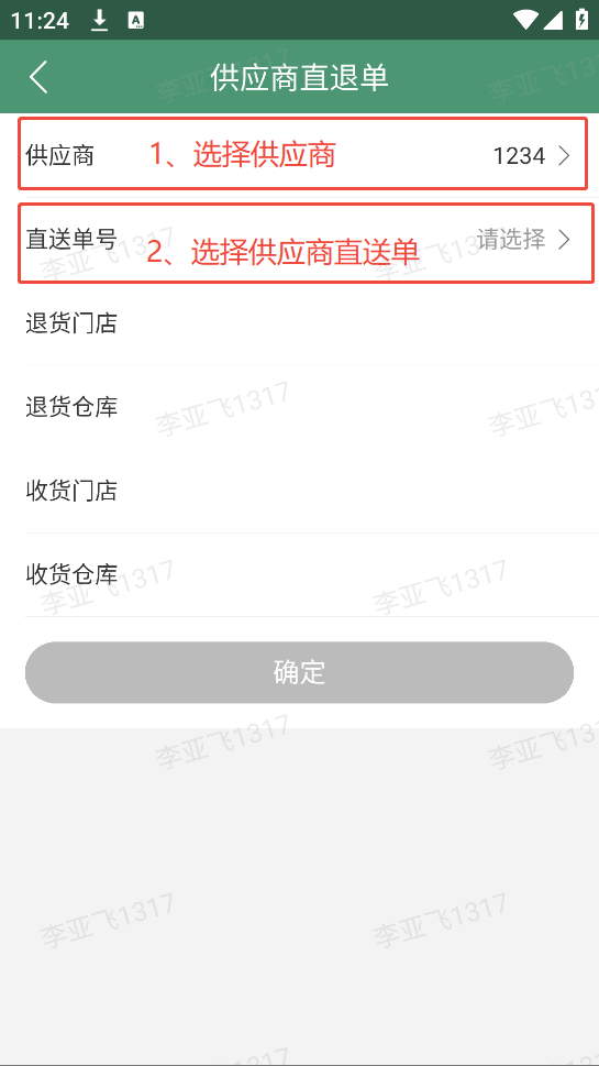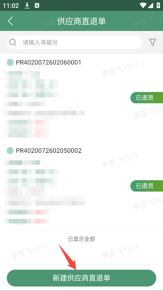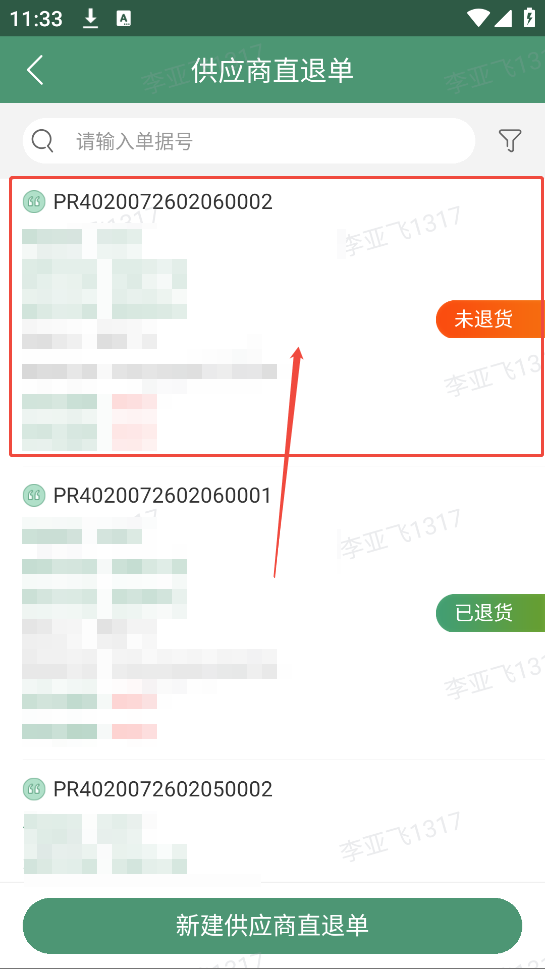 点击进入,可查看单据退货状态,以及底部”新增供应商直退单按钮“