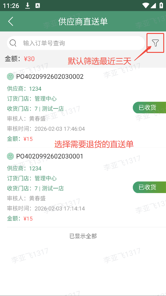 当选择已经生成供应商直退单的直送单时,会提示“该采购单已全部收货,请重新选择”