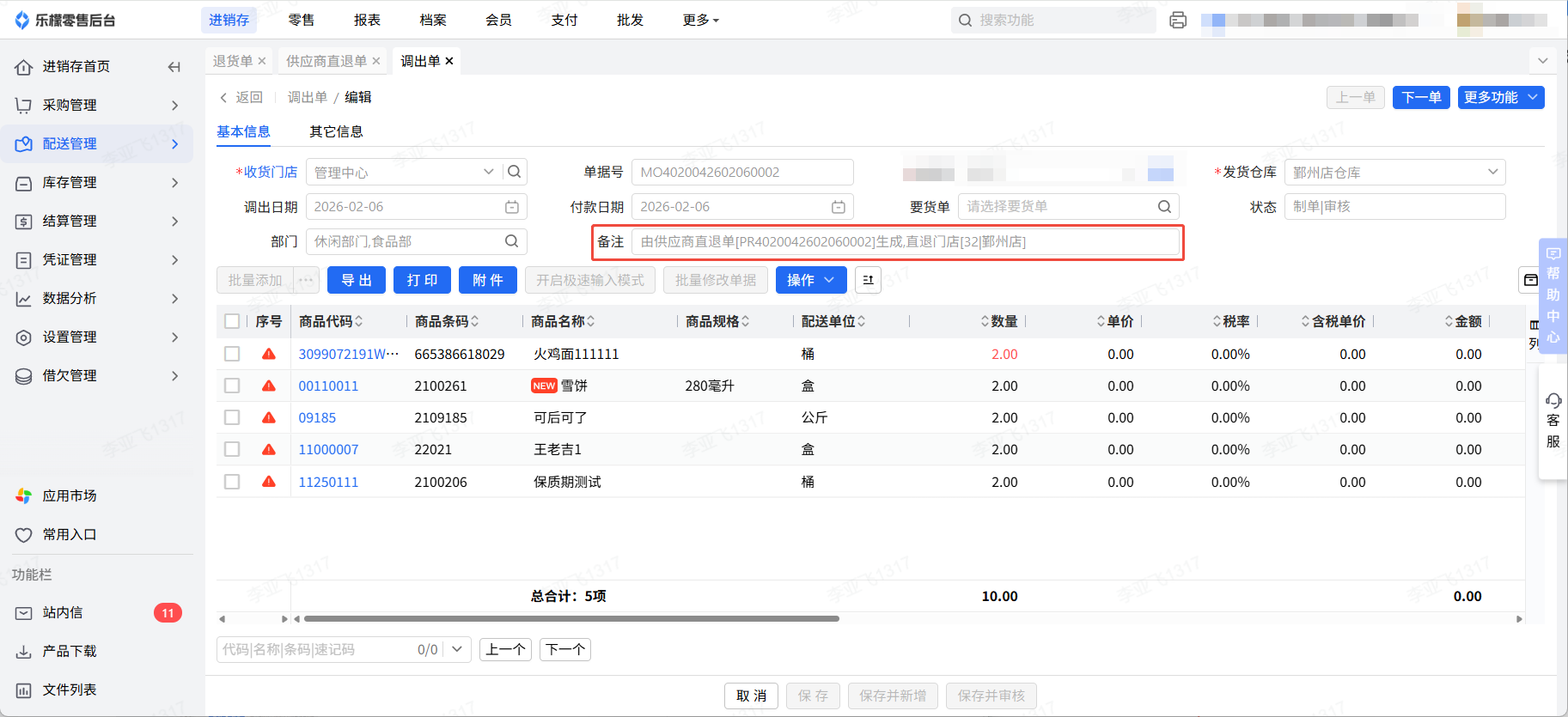 门店退货完成后,将生成退货门店一张调出单,管理中心一张调入单,以及一张退货单。