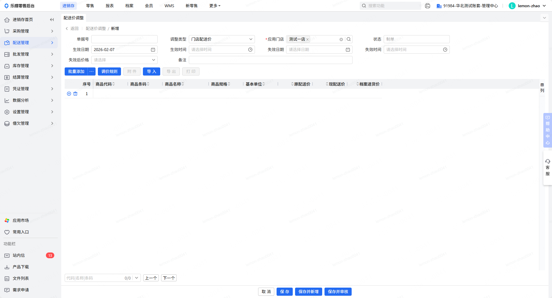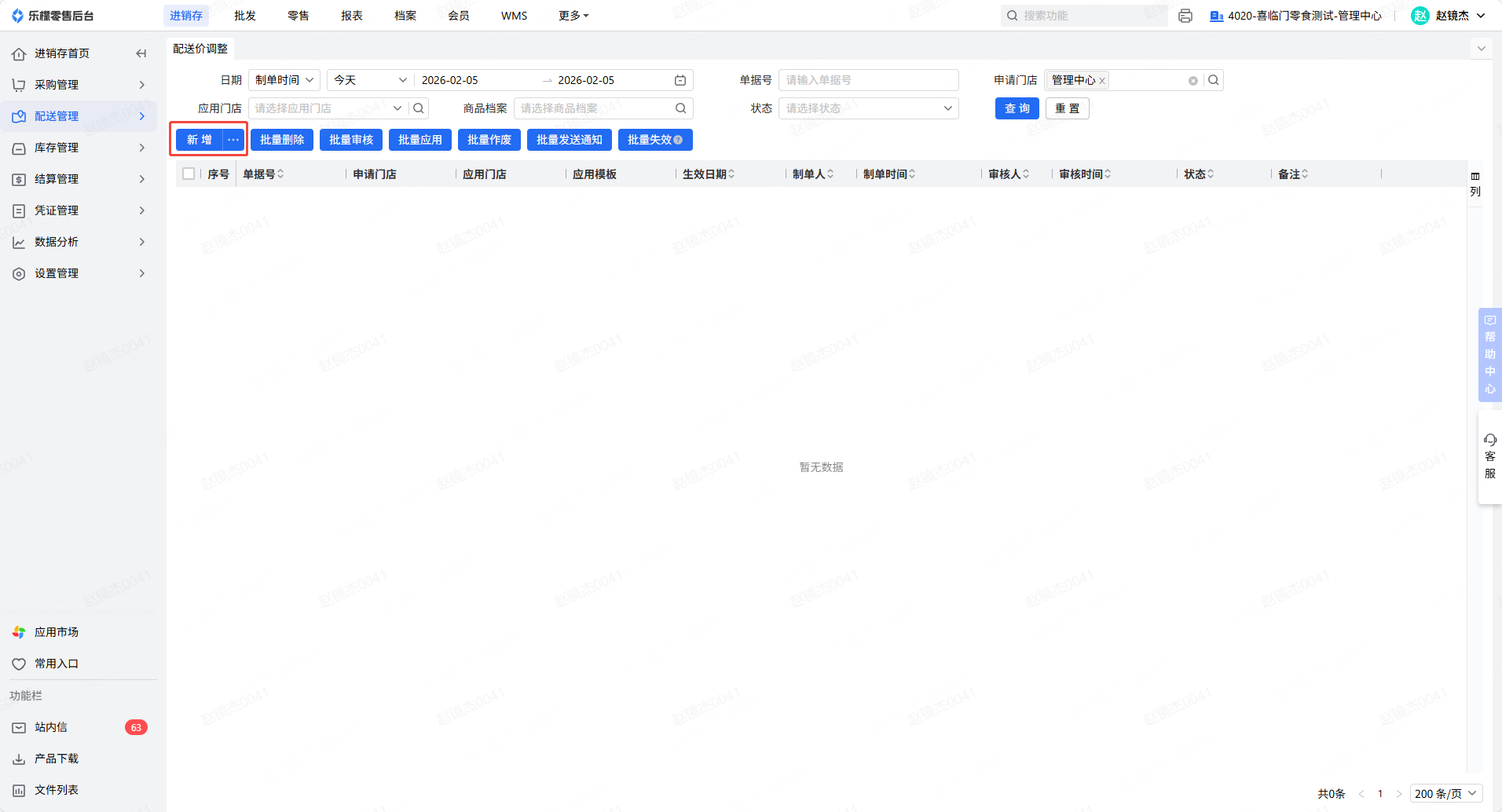 路经:应用-连锁管理-配送价调整。打开配送价调整页面后,点击底部的新增按钮。