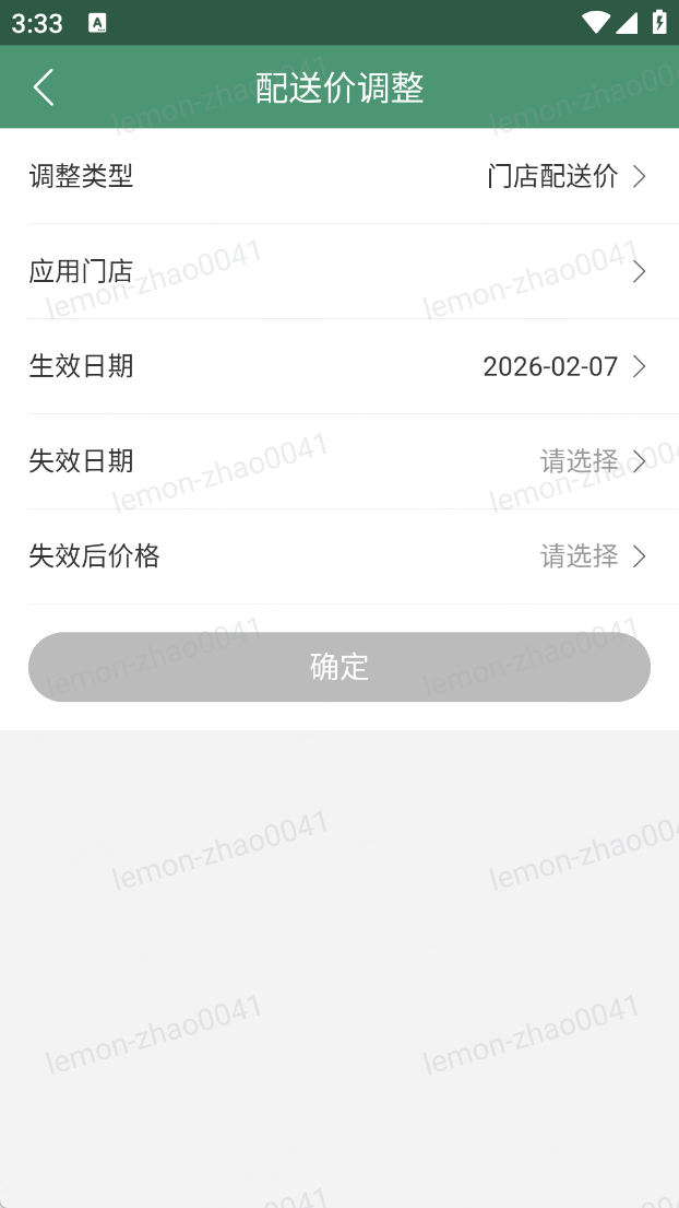 根据调价的实际情况,设置调整类型、应用门店、生效日期、失效日期、失效后价格,填写完毕后点击确定