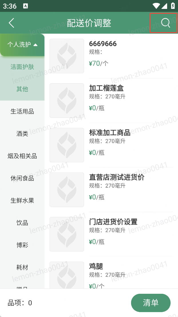 添加调价商品。也可点击左上角“放大镜”快速查找商品。然后设置商品的配送价,点击确定。