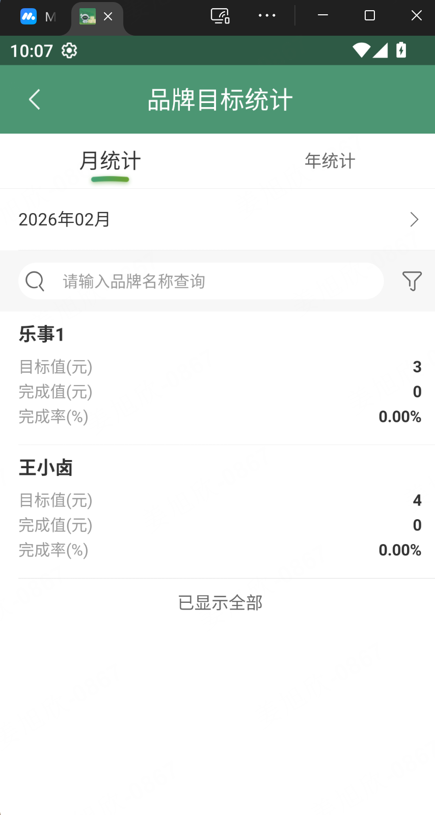 2、销售目标统计增加两个tab页“品牌月统计”、“品牌年统计”(在原来的月统计和年统计的基础上增加了品牌列和查询项),导出、查询统一用销售目标统计的导出、查询权限控制,需注意四个tab页 完成值计算=销售金额-退货金额-货补金额