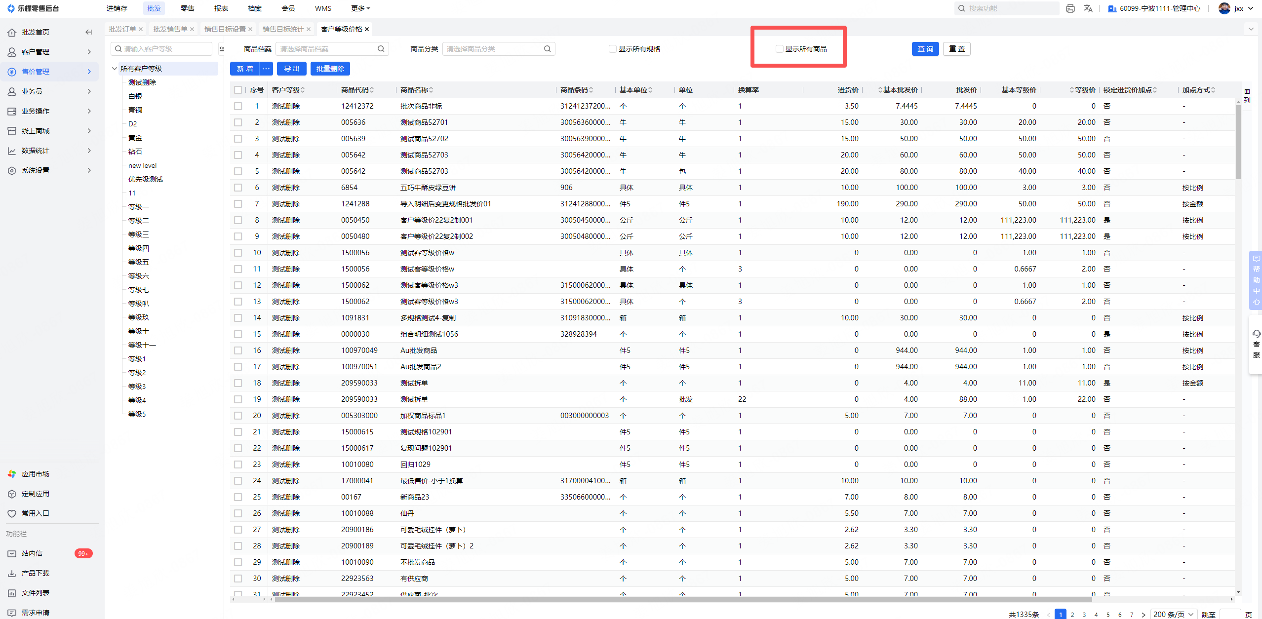 1、客户等级价页面:新增一个查询条件“显示所有商品”,默认不勾选;