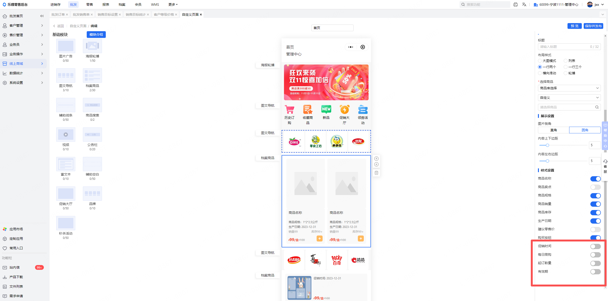 1、自定义页面-商品档案-样式设置:新增四个字段“促销时间”、“每日限购”、“起订数量”、“有效期”,开关默认关闭