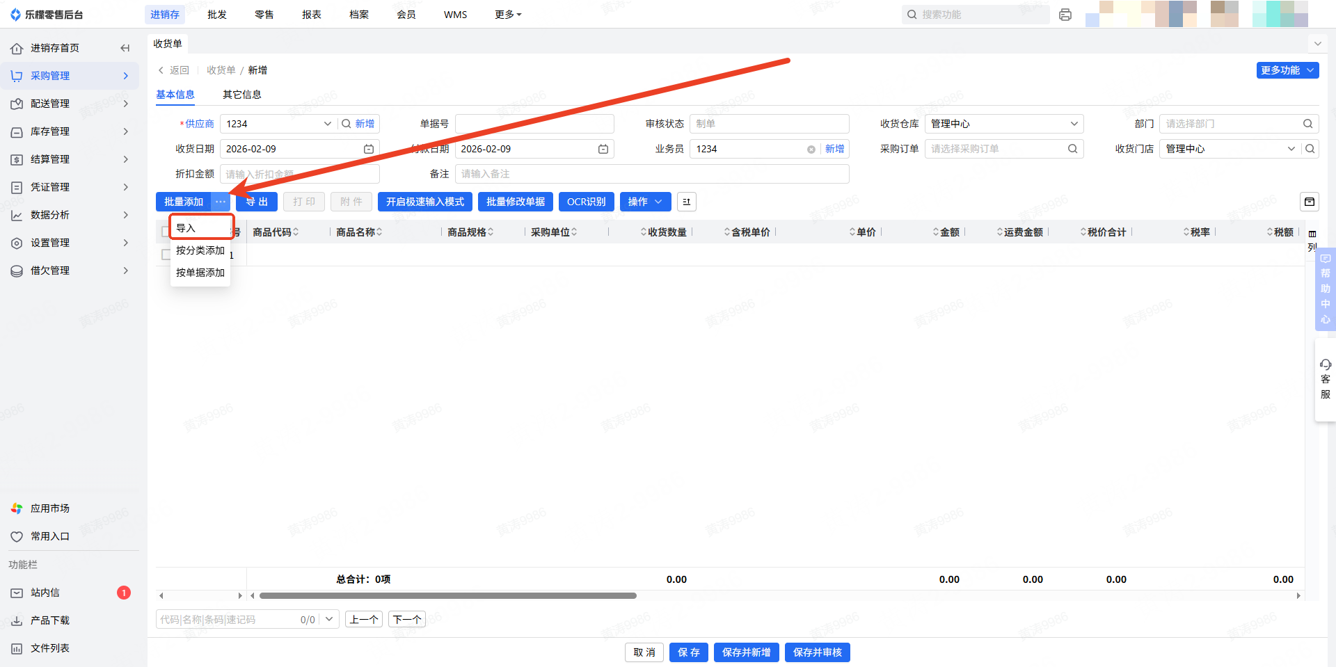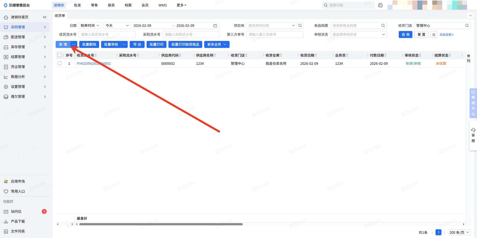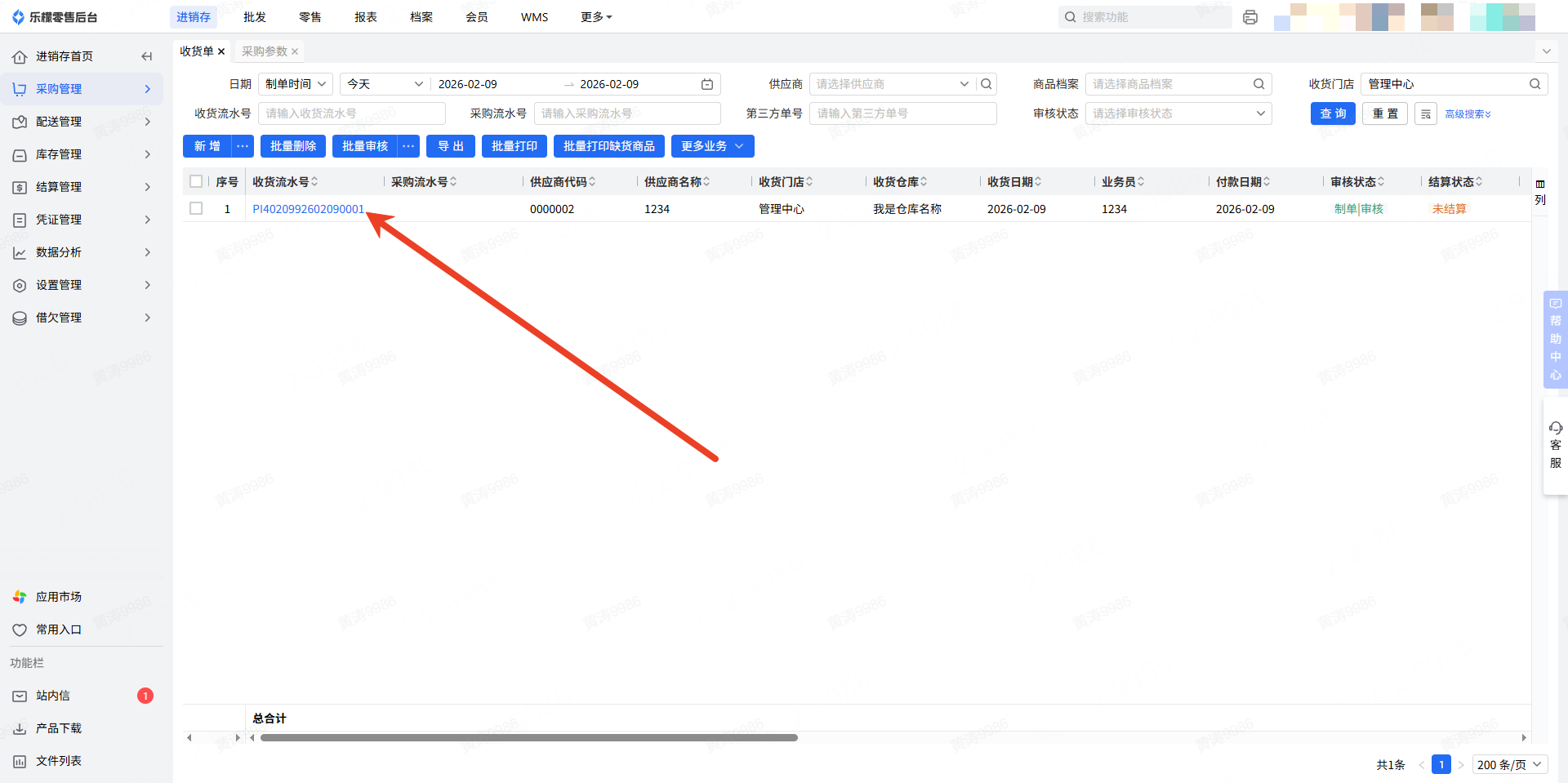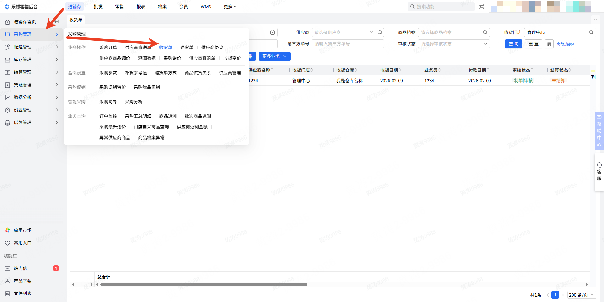 👉【操作路径】:1.进销存—采购管理—收货单