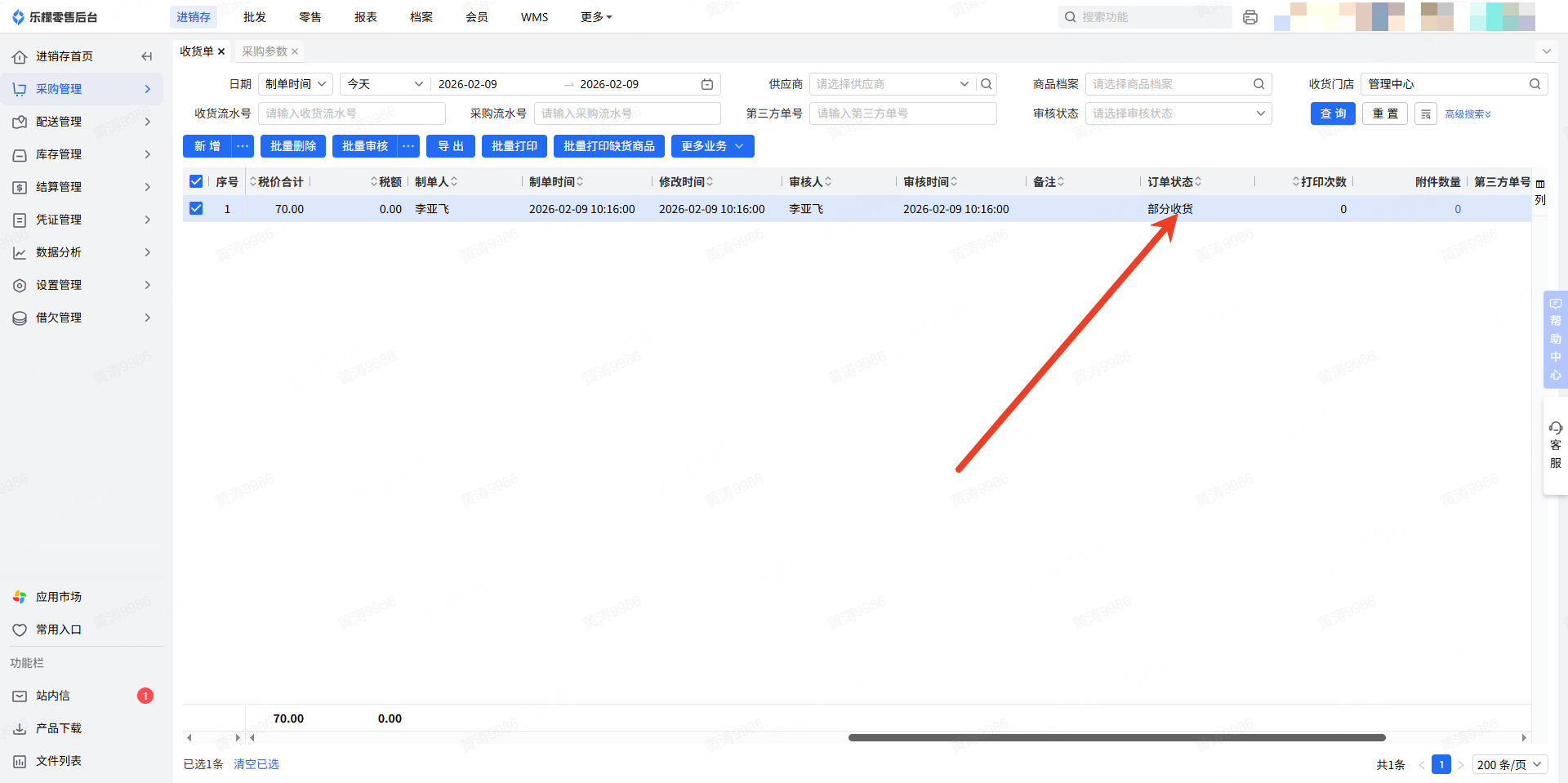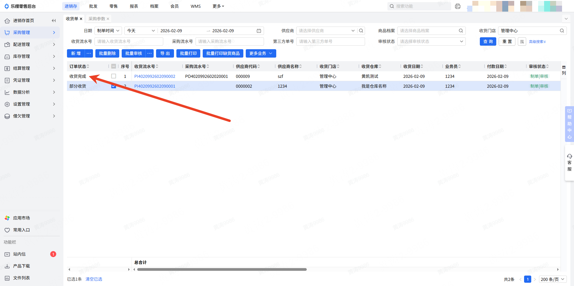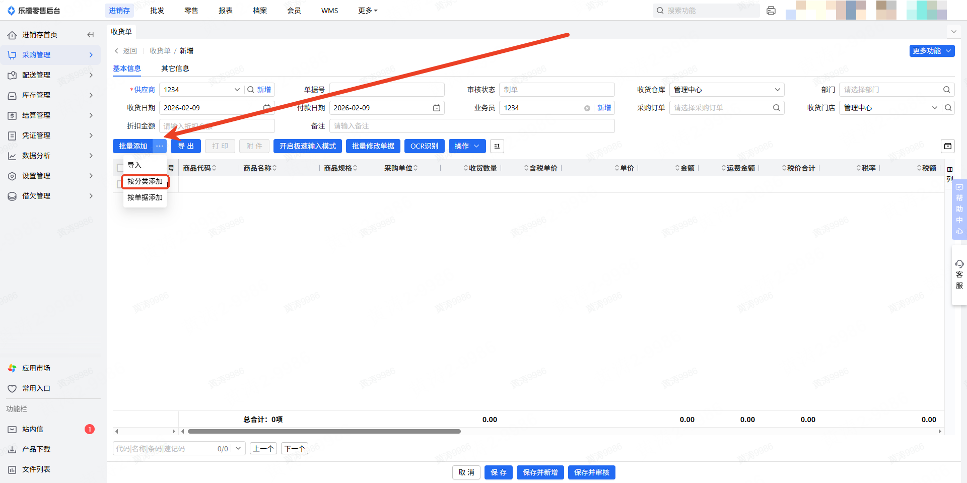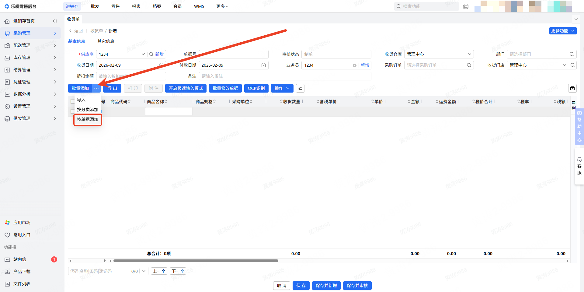 👉【操作路径】:1.进销存—采购管理—收货单