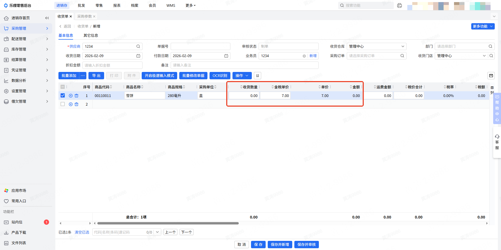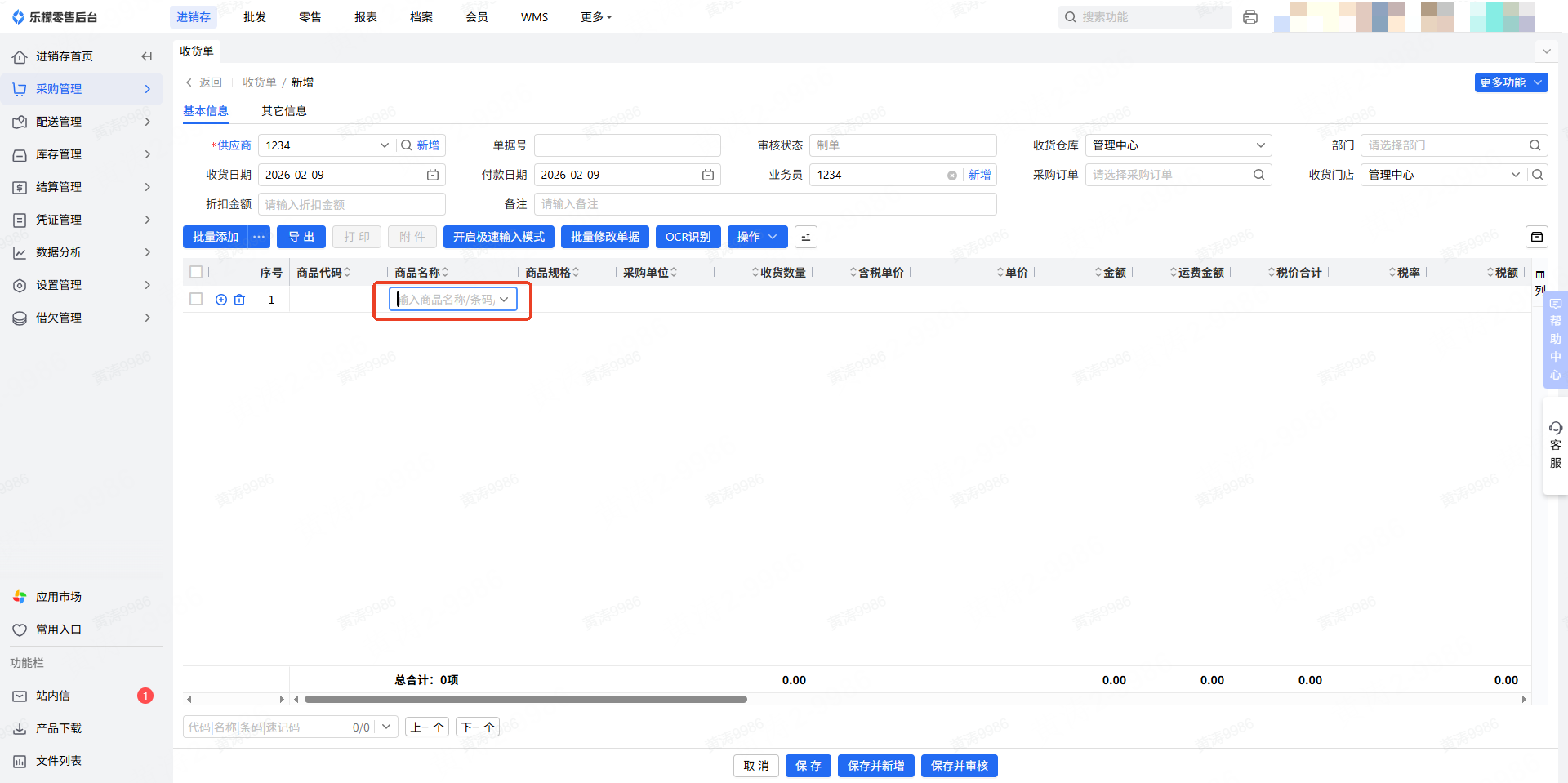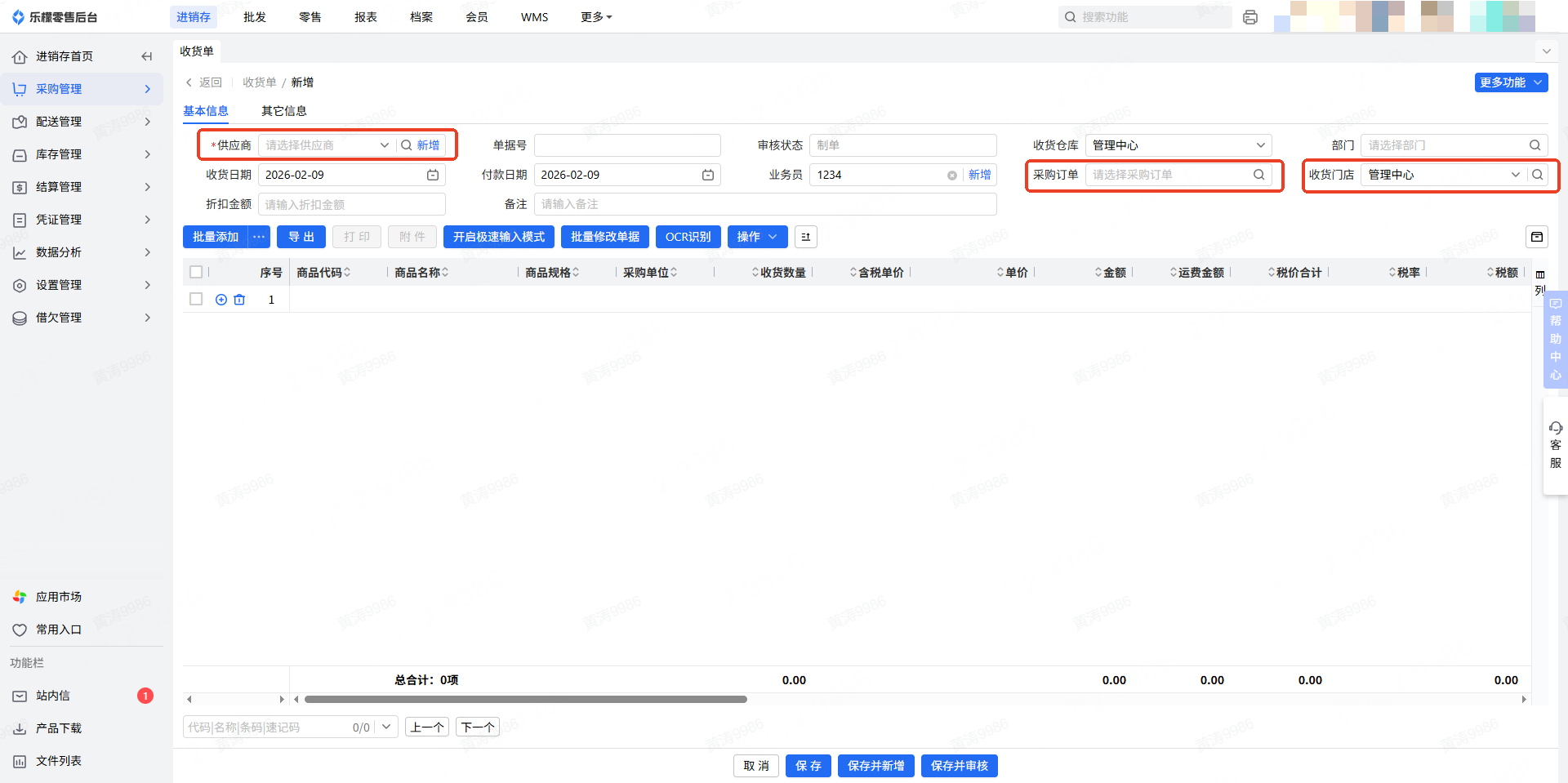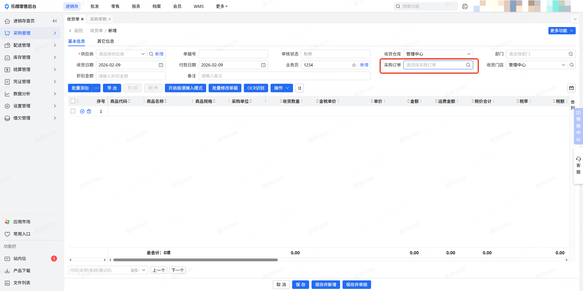 保存并新增:保存当前单据,同时新增一张空白收货单,新单据均可后续修改
