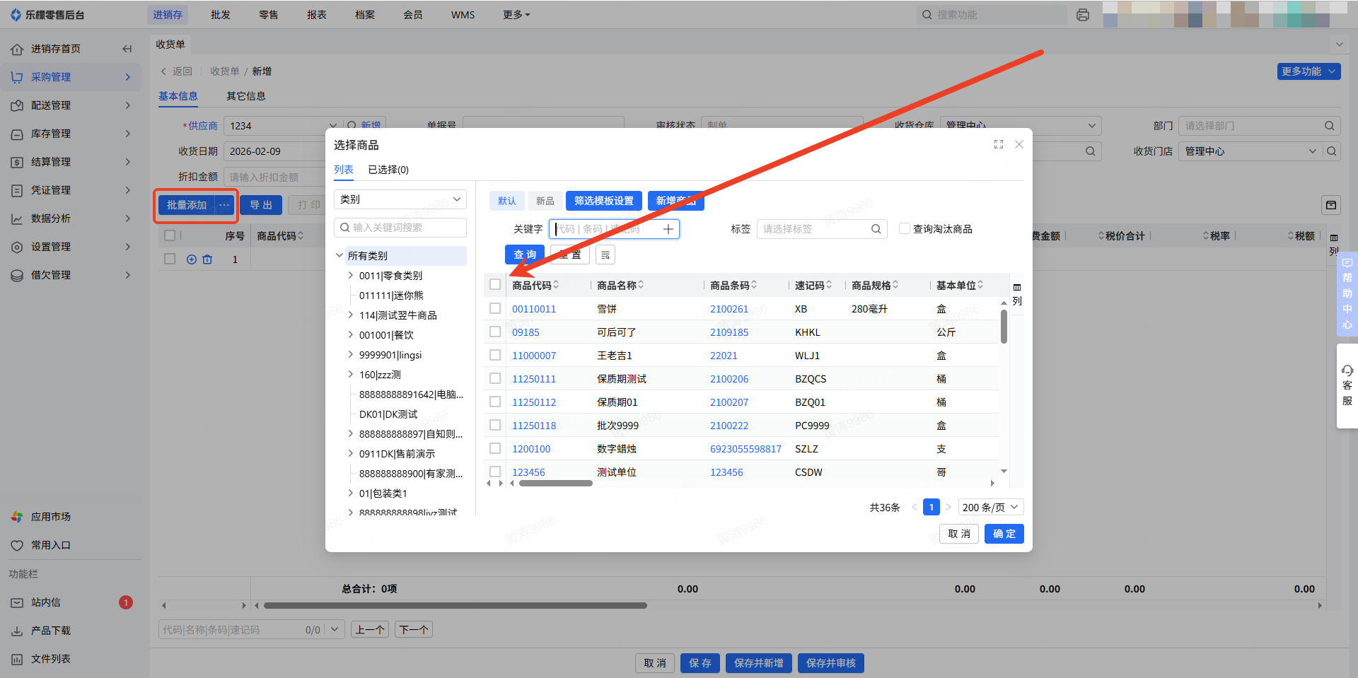 3.点击”批量添加“按钮,进行采购商品的添加