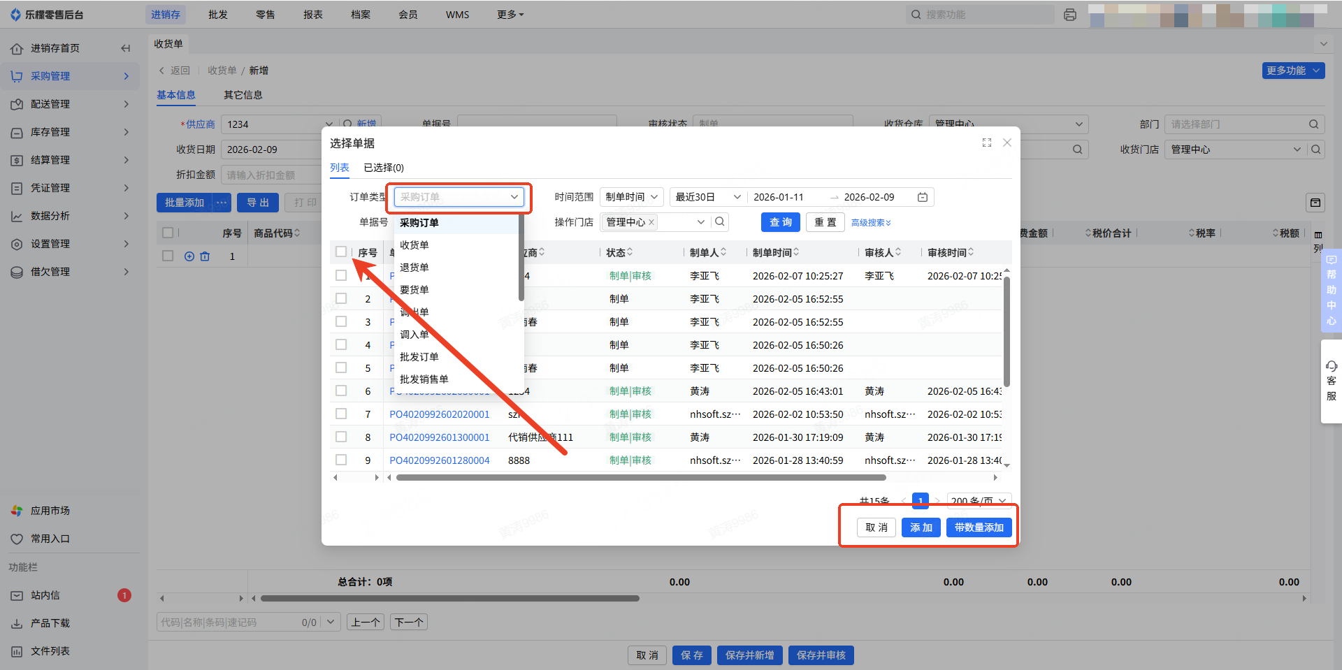 (5)支持按单据添加商品明细:可引用系统内采购订单、收货单、退货单、要货单、门店调出/调入单、批发订单/批发销售单等单据生成明细,选择对应订单类型并找到目标单据后勾选,点击「添加」(仅导入商品,不带数量)或「带数量添加」(同步原始单据商品数量),即可将单据内商品明细导入至当前收货单。